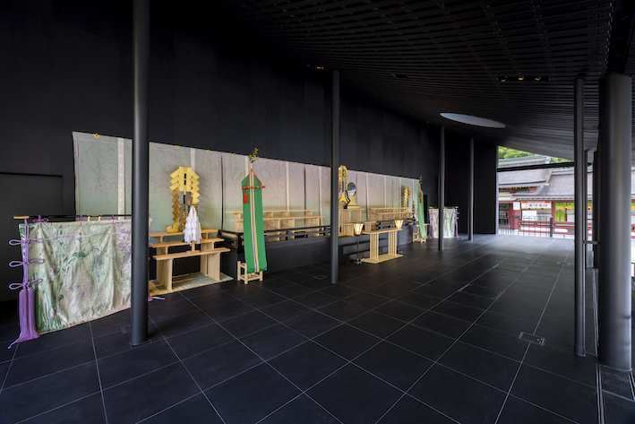 そして、《マメ クロゴウチ(MAME KUROGOUCHI)》がデザインを担当した御帳(みとばり)と几帳(きちょう)には、現代の織機を用いながら、古代染色などの古来の手法と融合させて作った美しい生地が使われ、社全体を含む生命の景色が表現されている。