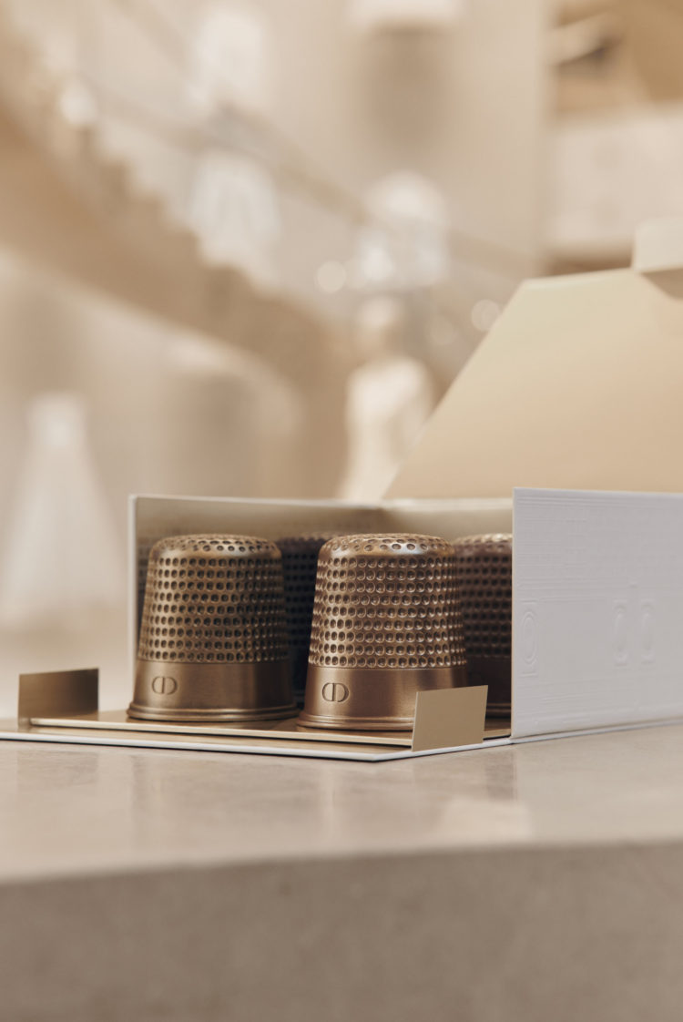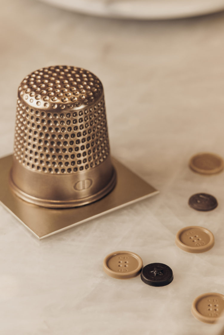 指ぬきの形をしたチョコレートを割ると、ムッシュ ディオールの幸福のシンボルである星の絵や、「CD」の文字が刻まれたボタンの形のチョコレートなどが入っている。ギフトとして持ち帰ることができるほか、店内のカフェスペースでも注文可能。「ラ パティスリー」のシェフ、ジャン・アンペールは、人気料理番組「トップシェフ」に出演したことで一躍有名になったフランスを代表する料理人の一人。店舗に備えられた三つ星レストラン「Monsieur Dior」や、ファレルウィリアムスが経営するレストランの料理長も兼任している。