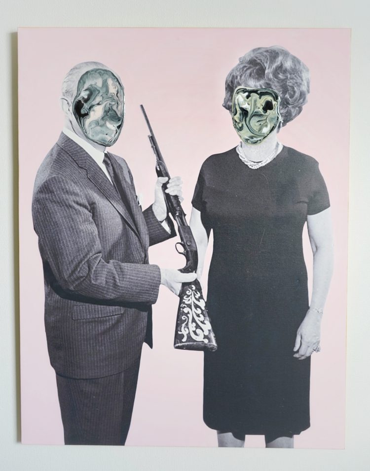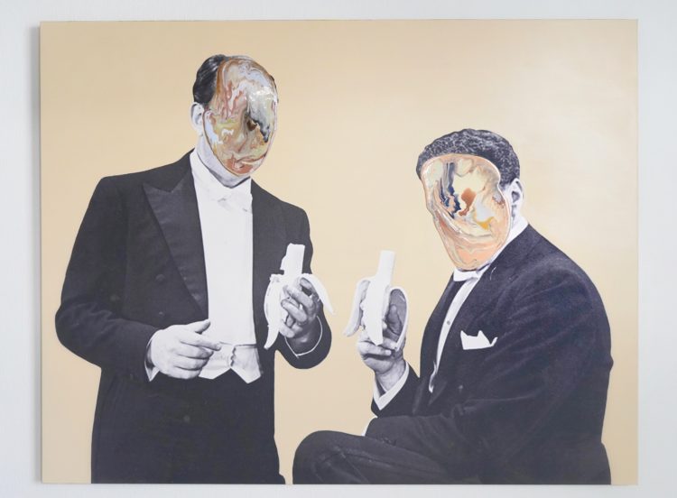 作品中にみられる、マーブリングされた顔を持つ舞台俳優たちは舞台上、あるいはSNSの世界において「他者」が私たちの人格形成に与える影響力を表現している。