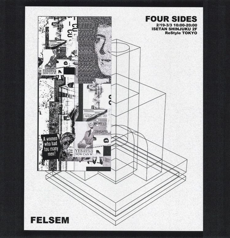 そんな二人が立ち上げたミニマルとストリートの融合をコンセプトに活動するクリエイティブチーム「FELSEM(フェルセム)」が初の作品展「FOUR SIDES」を伊勢丹新宿店で行う。本展では「多面性」をテーマにしたアート作品が展示され、また会場限定のTシャツ販売も行われる。