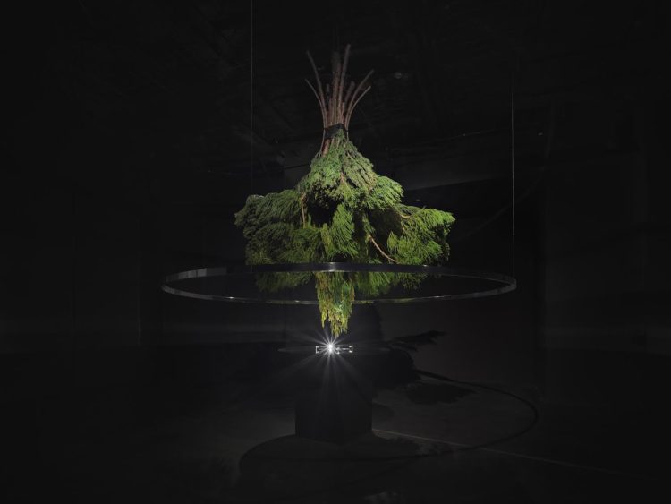 また、本展は、石川県の広域に水を供給する水源地“白山”からインスピレーションを得た諏訪が、自然の循環を体感できるインスタレーションとして披露。コロナウイルスが蔓延する2020年から制作を始めた立体作品「タリスマン」をメインのモニュメントとして展示するほか、白山で間伐された杉の枝葉を用いた作品による、自然のエッセンスで満たされた空間となった。