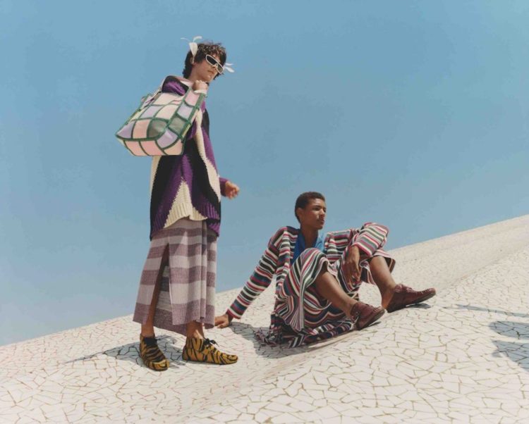 丈の長いボーダー柄のジャンパーやチュニックをまとってカタロニア州郡の丘に佇むモデルたちは、まるで放浪者を想起させるかのようだ。彼らが纏う《ロエベ》の新たなメンズコレクションは、バングラデシュ産コットンや、手染めされて編まれたブルキナファソのインディゴ、そして日本産の極細ブルーリネンでできたデニムとパンチ穴が施されたコットンガーゼなど、世界中の究極のファブリックが集められて構成されている。また、一見奇抜な円形の真鍮製チョーカー「ディーター・ラムス」や羽のイヤーカフやブローチは本コレクションの特徴である細長いシルエットに共通するスケール感を持ち合わせながら、コレクションのストーリー性を際立たせるようだ。