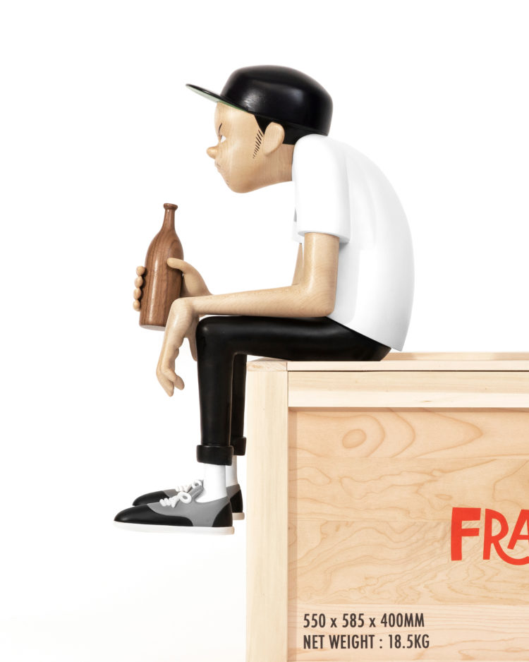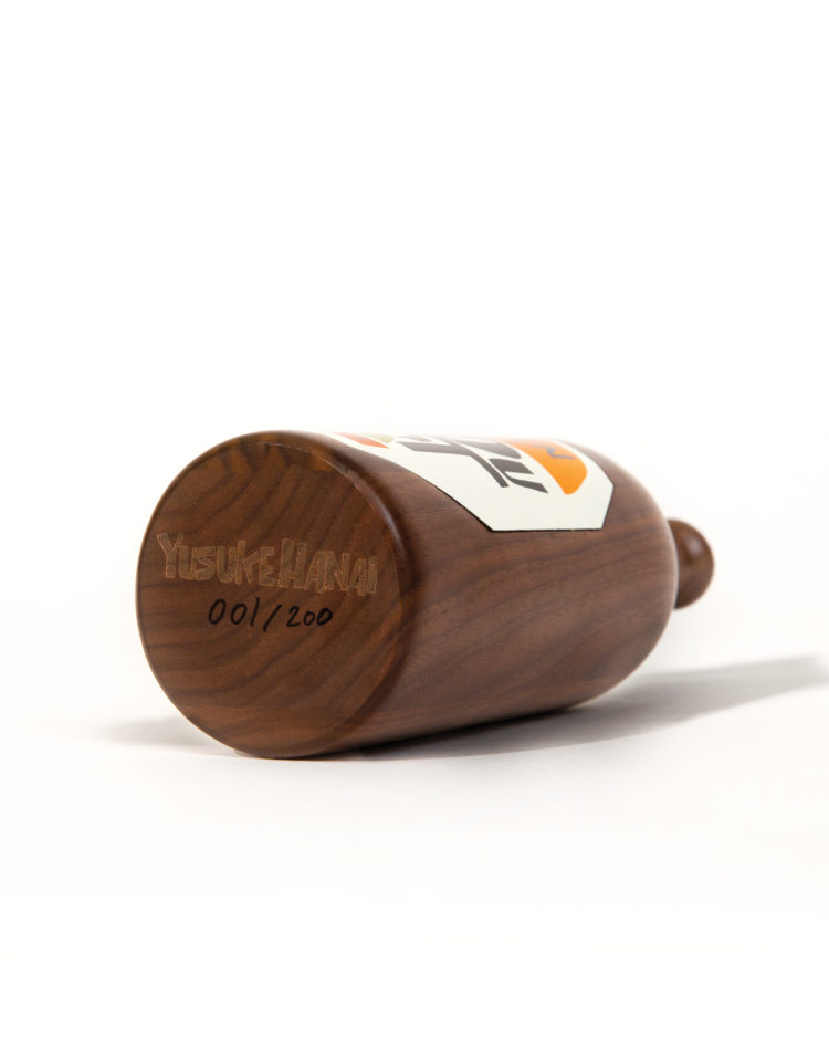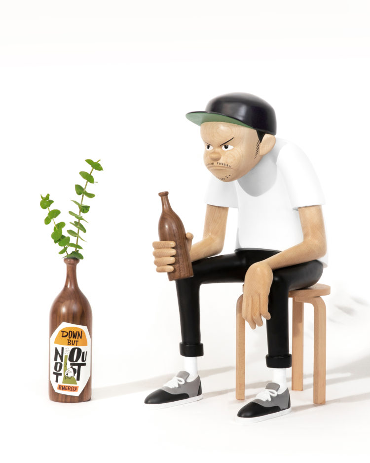 「今回発表するウッドスカルプチャーは普通のフィギュアよりすこし大きめですが、木彫りの人形なので北海道の木彫りの熊に腰掛けてもいいし椅子に腰掛けさせても、棚のエッジに腰掛けるように置いてもいいです。たまに眺めて、失敗してやけ酒している馬鹿な男を笑ってください」と花井氏はコメント。同時に発売となる高さ約8.7インチのウッドボトルは一輪挿しなどインテリアとしても楽しめるアート作品だ。