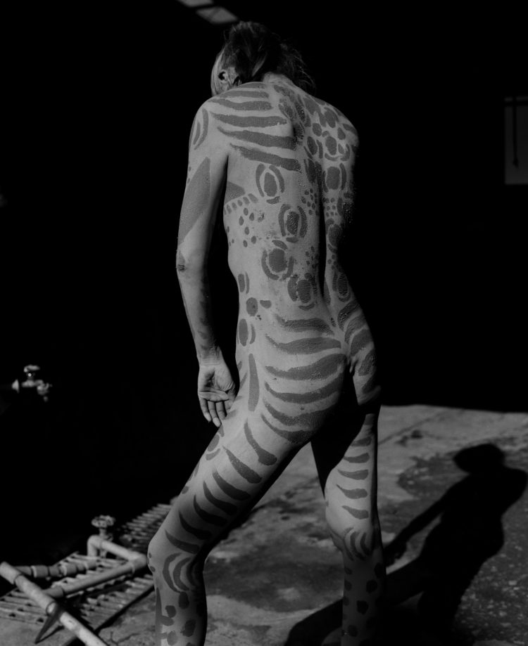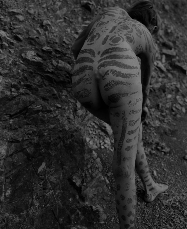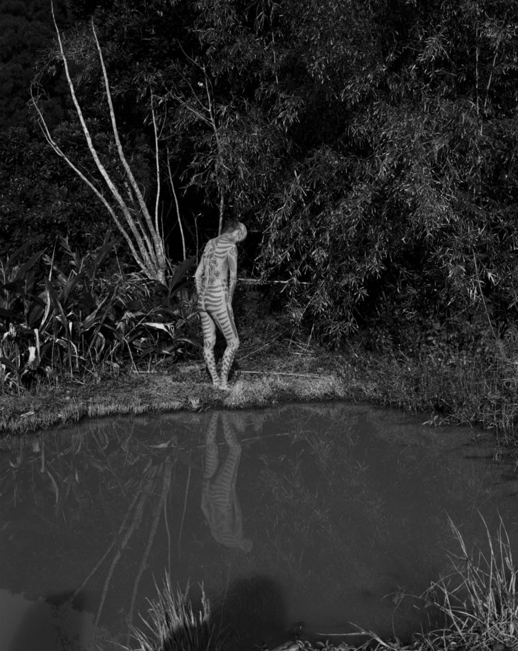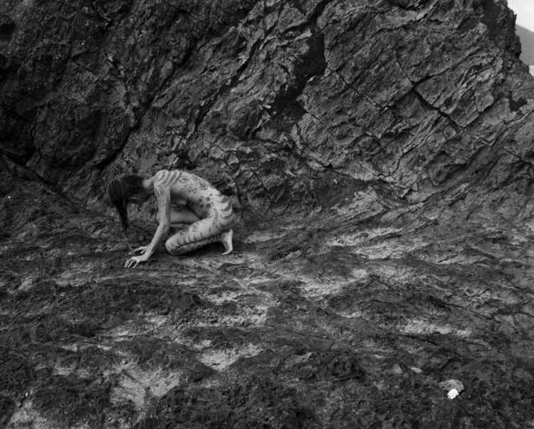 森に住み、観察し、音を録り続けるOLAibi。かねてより惹かれていた「泥」を纏った彼女の身体には、画家・絵本作家のミロコマチコによるボディアートが描かれた。