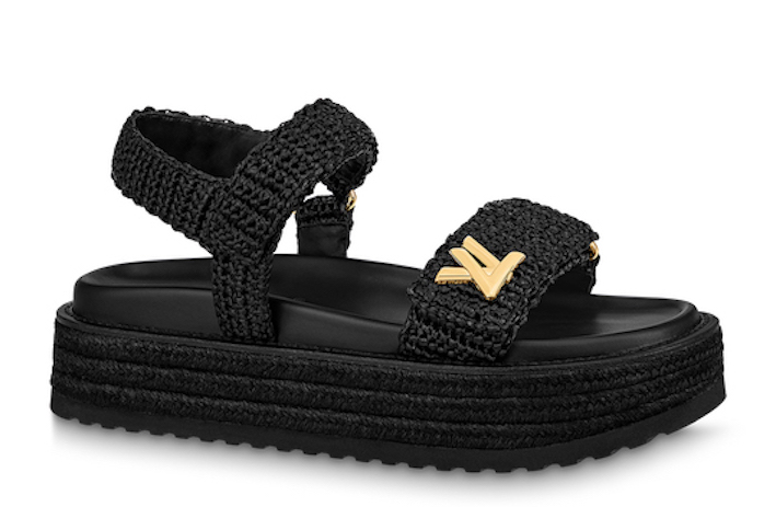 ラフィア(ヤシ)を使用したアッパーとロープ編みのプラットフォームの組み合わせに、卓越した職人技が光るサンダル。2本のベルクロ・ストラップの片方には、バッグ「ツイスト」から着想を得たゴールドカラーのLVイニシャルのアクセサリーがあしらわれている。ラバーアウトソールで仕上げた、トレンディで快適な履き心地の一足。