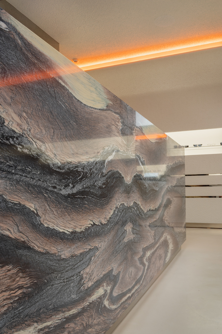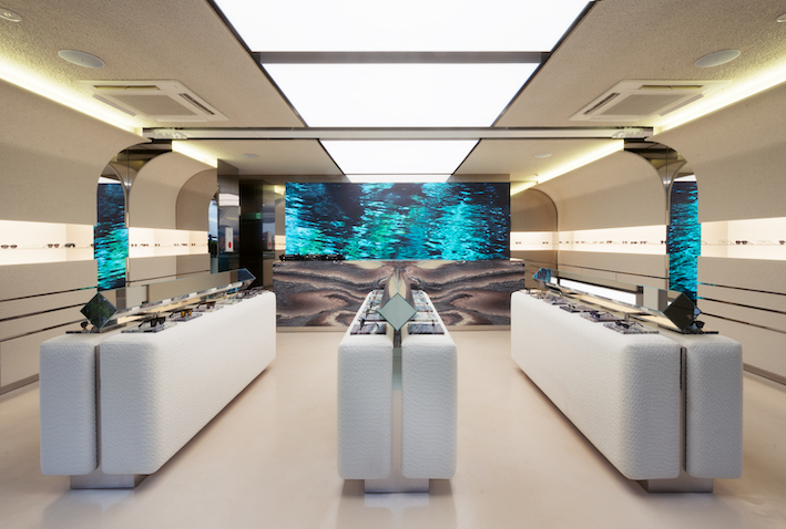 大阪店と同様に東京店でも“光の表現”を空間づくりのコンセプトに掲げ、大型のデジタルサイネージを用いた映像やライティングによるデジタルなアプローチで空間が彩られている。天然石のカウンターや日本の職人技術である左官を取り入れた内装など、テクスチャーの異なる素材をあしらっている点も見逃せない。
