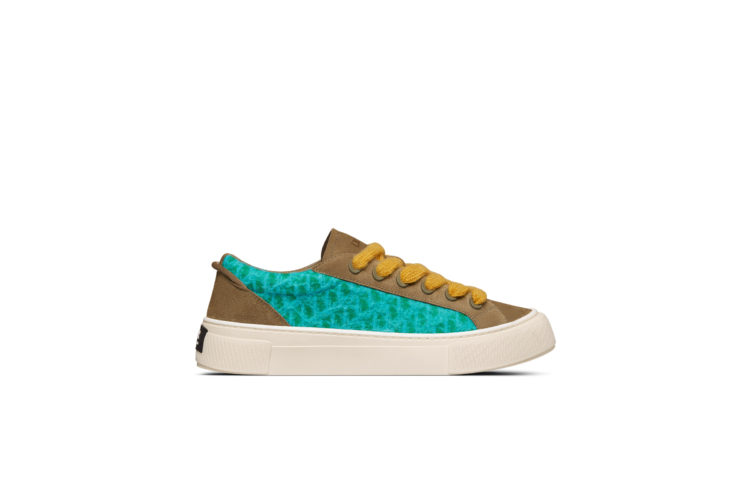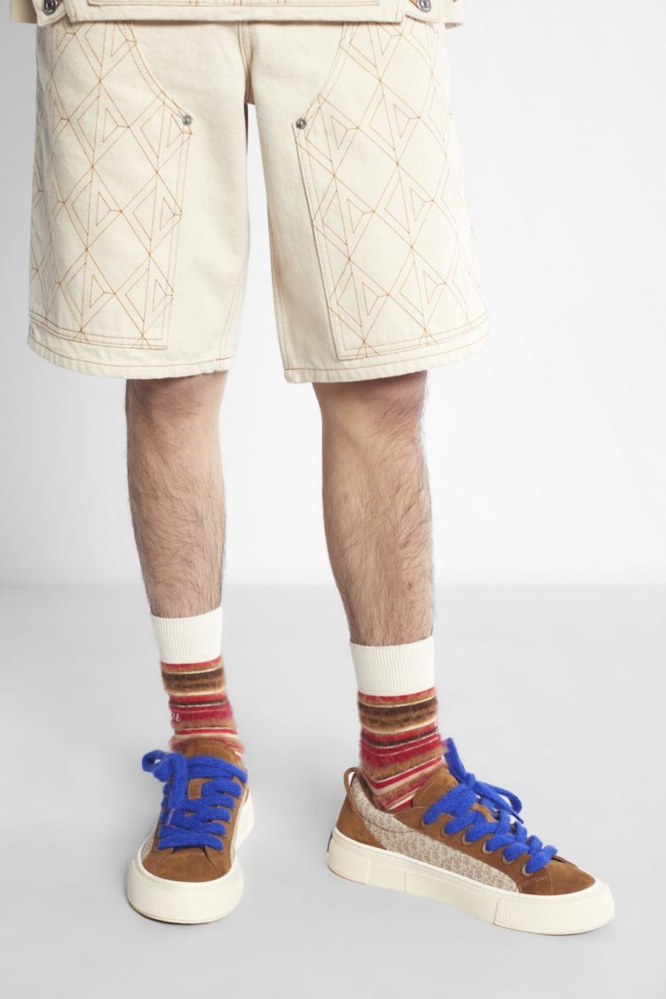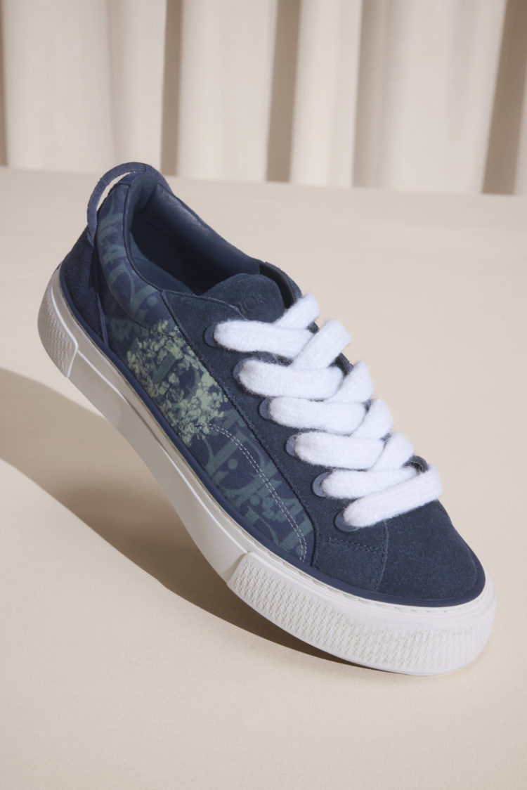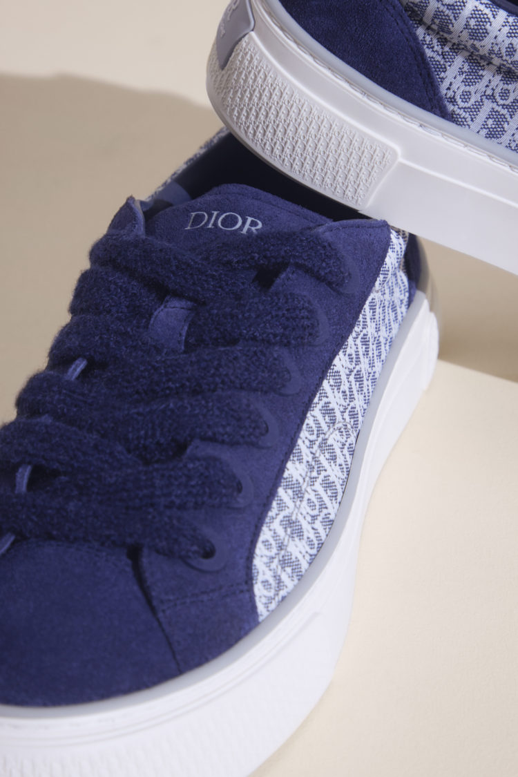 「DIOR」ロゴがサイドにあしらわれた、モヘアのシューレースの美しさが際立つモデルと「ディオール ティアーズ」カプセルコレクションのためにデニムで再構築されたアイコニックなモデル。