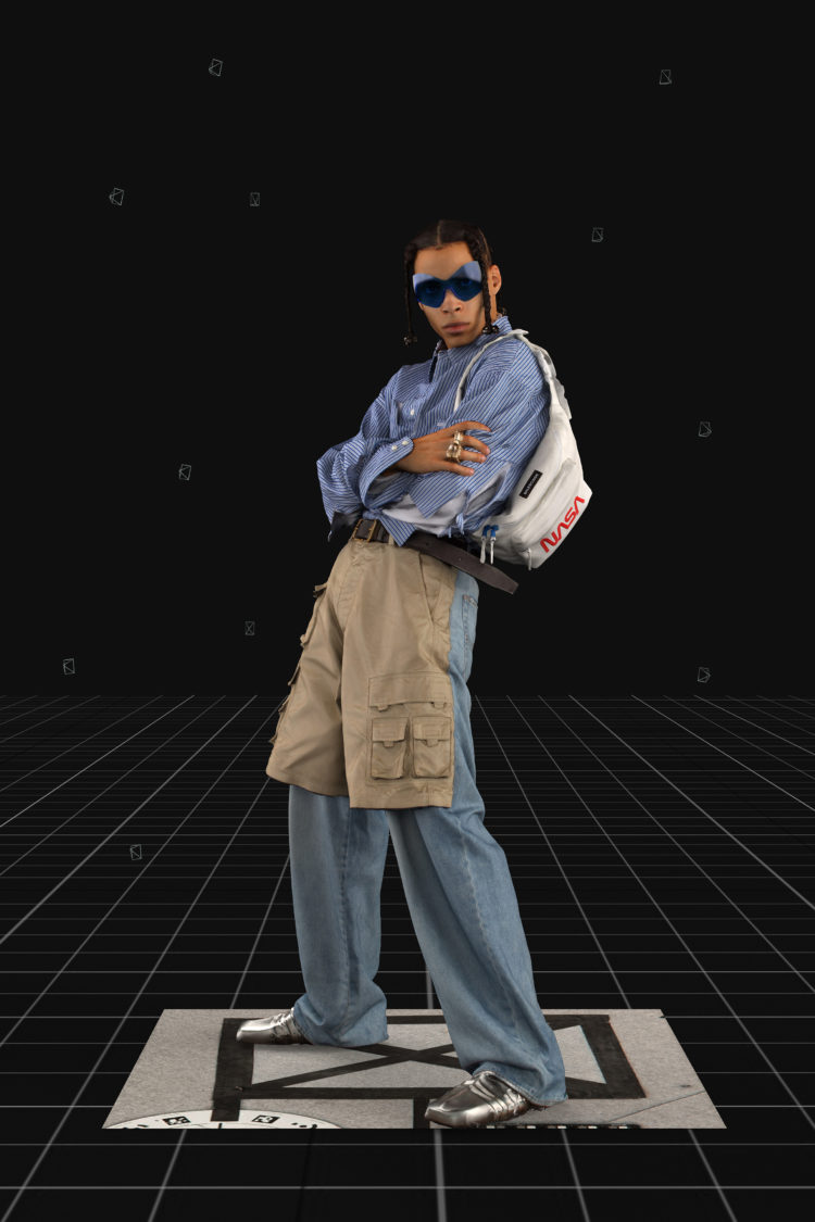 パンツの上にレイヤーされたジーンズや、スウェットパンツにボクサーショーツのウエストバンドを加工したアイテムは、ある素材が別の新たな目的に使用される未来の世界を解釈。多くの製品が新しい機能を果たせるように、コートやフード付きケープとして作り替えられたブランケットや、ダッフルバッグとして使用できる外側に大きなポケットがついたフーディなども印象的だ。
