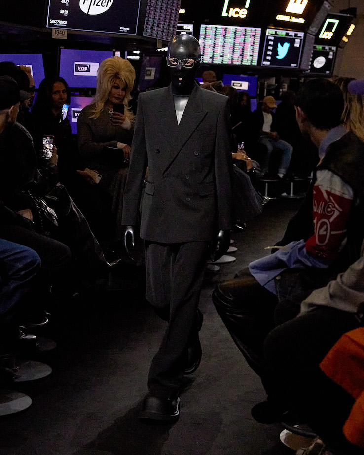 ニューヨーク証券取引所のトレーディングフロアで行われた今回のショー。フェティッシュなボディスーツによってアイデンティティが覆い隠されたモデルが、デムナによるSpring23コレクションを着用しランウェイを歩いた。