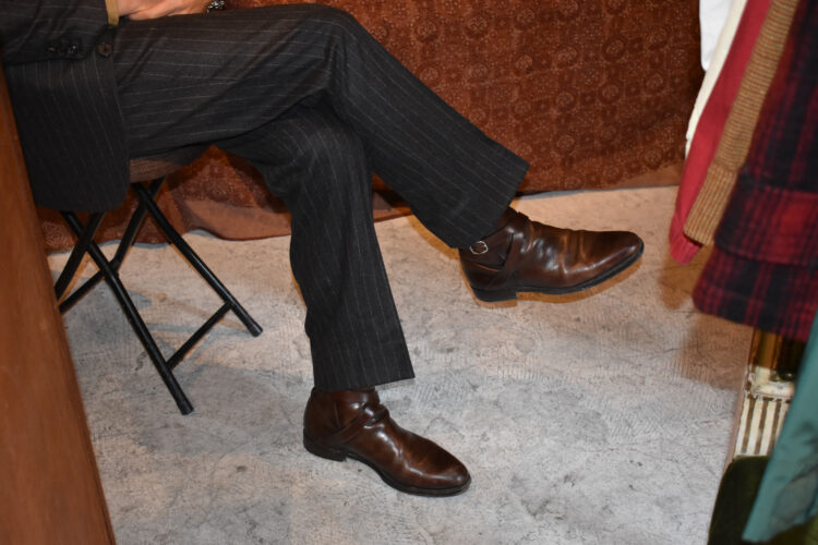 中のトップスは《ウィリス アンド ガイガー》のサファリシャツ。足元はいわゆるビジネスシューズやドレスシューズではなくブーツを着用。些細な違いだが、足を組むことでブーツを履いていることがわかる。