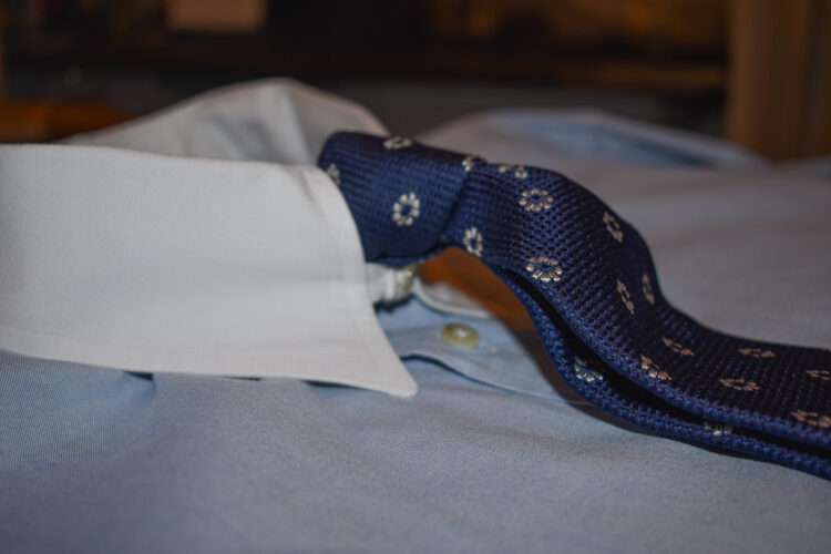 さらにスーツのインナーに着るシャツとして、《BROOKS BROTHERS(ブルックスブラザーズ)》のタブカラーシャツをススメてくれた。左右の襟についたタブを止めることでタイを立体的に見せ、華やかな印象を与える。「ワイドカラーは基本的に太いタイをするための襟なのですが、タブカラーは細いタイの方が締めやすいです。昔はシャツの襟の形に合わせて、ネクタイも今より種類が多かったです」。