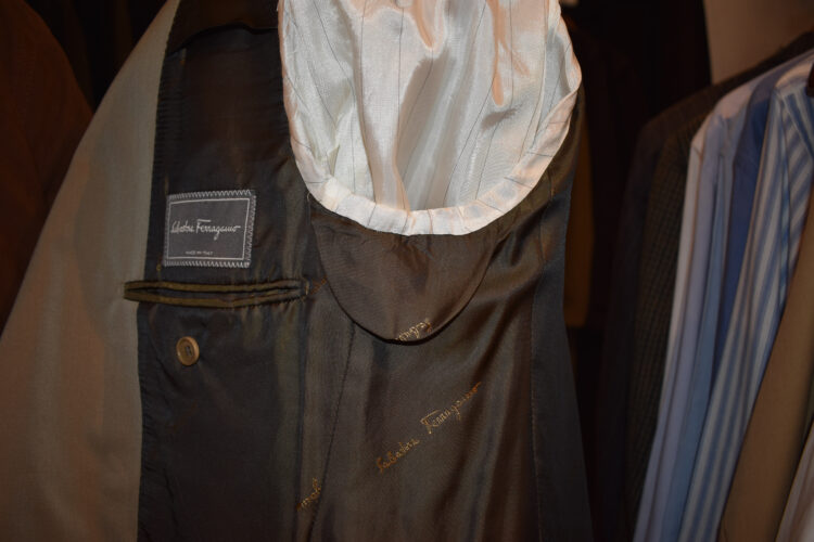 続いては《フェラガモ》の推定90年代前半のスーツ。布地は光の加減で色が柔らかく艶やかに変化する玉虫調。こちらもD管止めや際縫いなど、随所に見える丁寧さにデザイナーと職人のこだわりが見える。