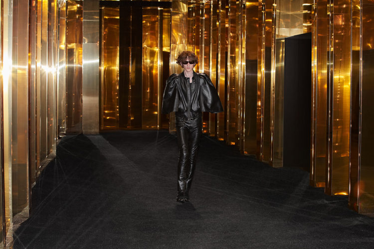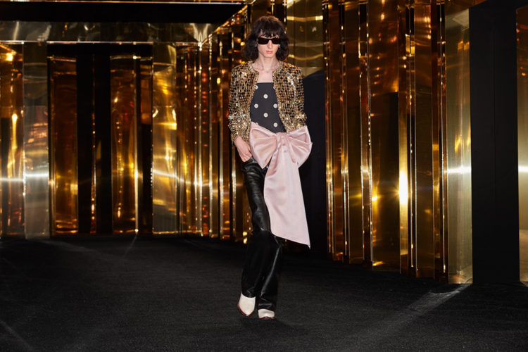 テーパードのローライズパンツに5cmのヒールを合わせたルックや、「5」と名付けられた襟のついた白いシャツに、スキニーな黒いタイを合わせた2000年代初頭を思わせるシャイニーなルック、コレクション全体に見られる《セリーヌ(CELINE)》の真髄、ブラックシルエットのテイラード・スーツのルックなど、いずれもエディが自身のアイデンティティとして確立してきたスタイルに立ち返りデザインされた。