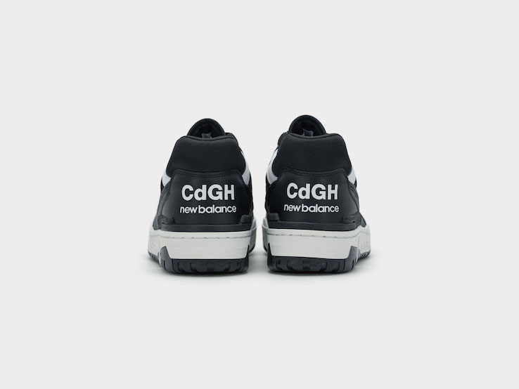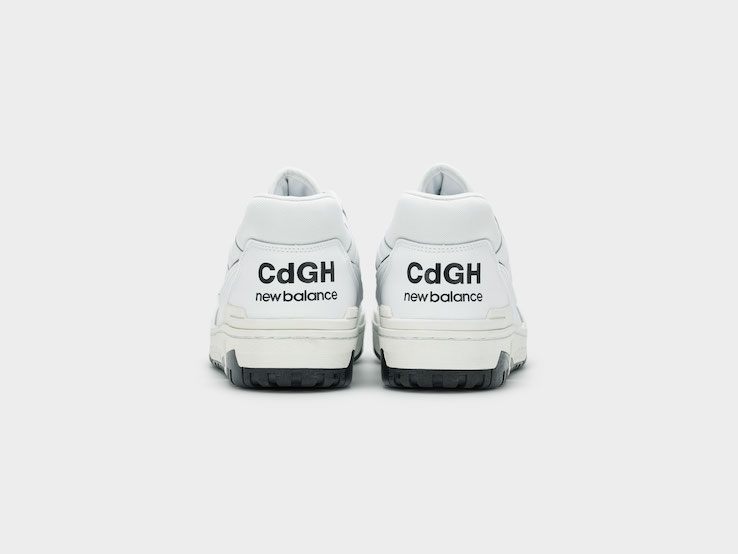 《ニューバランス》と《コムデ ギャルソン・オム》が発売するコラボレーションモデルでは、フォクシング(かかと部分)に「CdGH」のロゴが配され、上質なレザー素材をアッパーに使用してアップデート。