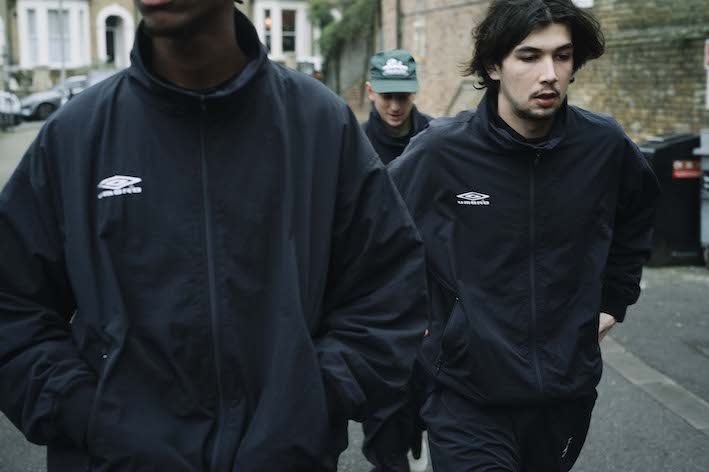 《コモリ》のロゴは一切入れず、90年代に使用されていた大文字の「UMBRO」ロゴのみを配したミニマルなデザインに、《コモリ》らしいルーズなシルエットが特徴のベンチコートやトラックジャケット、トラックパンツ、ホームジャージーなど計6型をラインナップする。