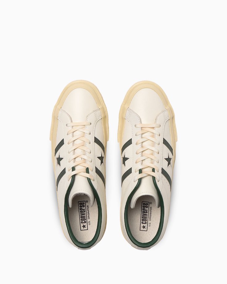 今回は、「U.S. ORIGINATOR」スペックのSTAR&BARSをベースに履き込まれたような雰囲気を演出した風合いのある柔らかなスムースレザーをアッパーに採用。ムラ感のあるシューレースや、経年したような質感と色を演出する艶出し加工を施した生成りのテープ、「U.S. ORIGINATOR」の印字が施されたヒールラベルなどの「U.S.ORIGINATOR」スペックが、デッドストック品のような雰囲気を醸し出している。