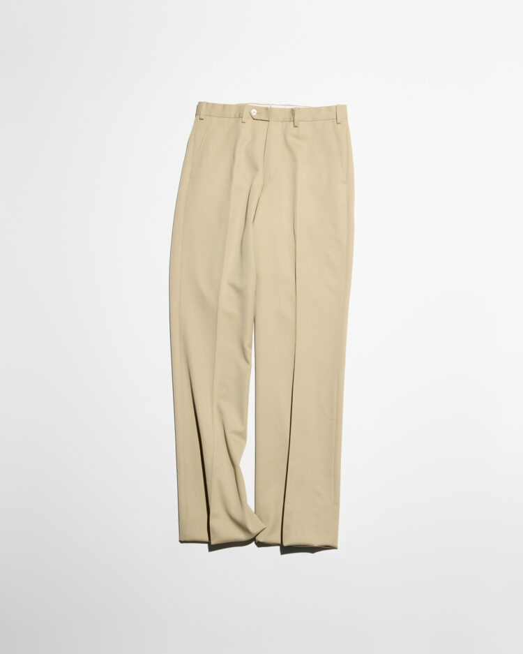 《ビボヤ》はノルウェー生まれのデザイナー、ティボー・ロゼッティが2023年に設立された。ヨーロッパでは基本的に受注生産のビジネスを行っており、プレタポルテのコレクションは2025年春夏の日本での販売が初となる。テーラリングの技術を大切にするデザイナーにとって、それらは仕立てられたモノであるべきという考えが強くある。しかし、最も美しいと考えるパターンで既製服を制作するという条件のもと、既製服を作成したという。美しいスラックスがスタイルを完成させるという美学を持つティボーにとって、ハイウェストのフレアモデルのスラックスは、ブランドを最も表現しているアイテムと言える。生地はUK製のベージュのギャバジンを使用、適度なハリがありながらも、着用した際に綺麗なドレープが現れる。テーラードがベースでありながら、デザイナーズらしい思想に基づいたクリエイションを行う《ビボヤ》に今からチェックしておきたい。