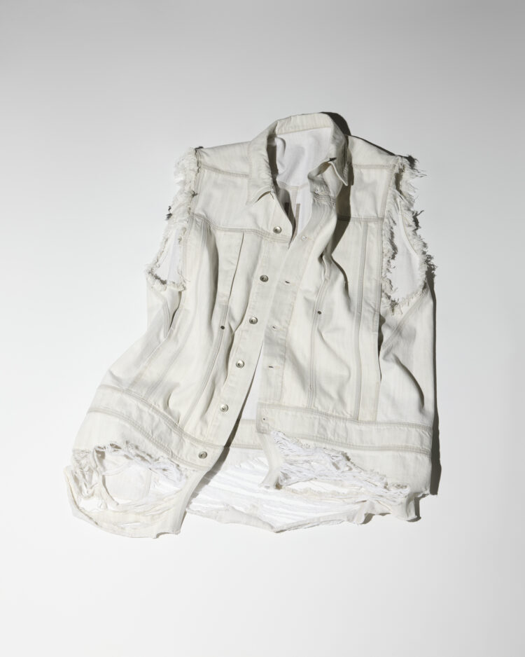 《リック・オウエンス》はパレ・ド・トーキョーで2026年春夏メンズコレクションを発表した。パリ市立ガリエラ美術館で開催中の《リック・オウエンス》回顧展「TEMPLE OF LOVE」と連動したコレクションのタイトルは「TEMPLE」。水盤の上に高い足場が設けられ、新作を着用したモデルがその上を歩いたあと、水の中に降りて潜り、噴水が上がる中で逆さ吊りになるなど、スペクタクルな演出を手がけた。白を基調にしたアースカラーのルックも目立った中で、異質な存在感を放っていたのが、袖が断ち切りのオーバーサイズのクラッシュ・デニム・ベスト。神秘的なムードをワードローブに取り入れたい。