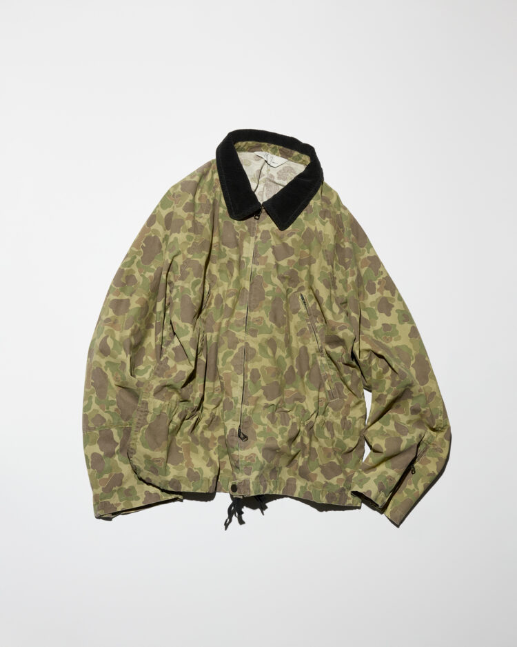 デザイナーの山近和也が手がける《アンセルム》は2026年春夏コレクションを初のランウェイ形式で発表した。継続して製作するカモフラージュジャケットを今シーズンはミリタリーではなく、古いアウトドアギアをベースにデザイン。VINTAGEのミリタリーから、一周回って新鮮さを感じたというアメリカのダックハンターとドイツのレインドロップを採用。加工によって色の濃度を落とし、同等程度の濃度になるまで再び色を重ねることで奥行きを持たせた。ダブルZIPの逆開で裾が跳ね、綺麗なAラインを描く。袖先はライダースジャケットのような仕様とし、ウエストコードを低めに設定した。着こなしのバランスに面白さを加えてくれるはずだ。