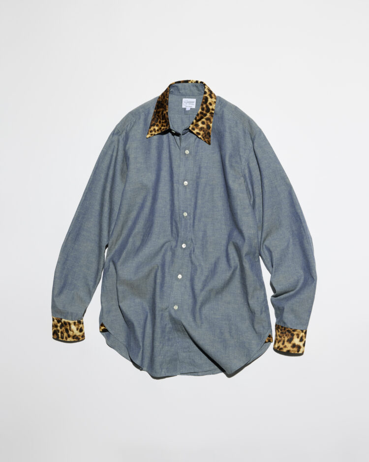 バルバドスに生まれ、ロンドンで育ったデザイナー、アンドリュー・イーストモンドが手がける《イーストモンドアパレル》。サヴィル・ロウの名門テーラーでカッターとして修業し、ニューヨークではヴィンテージディーラーとしての経験を積んだ後、ロンドン郊外のシャツファクトリーとともにコレクションを制作している。ジャーミン・ストリートやサヴィル・ロウの老舗にも供給する工場による英国生産を貫き、フルマシンメイドならではの端正で男性的な佇まいが魅力。本作はドレスシャツを基盤に、シャンブレー地のボディにベルベットのレオパード柄を襟元と袖口へ配した一着。クラシックなポインテッドカラーに柔らかな芯地を用い、伝統の中に程よい遊び心を忍ばせている。