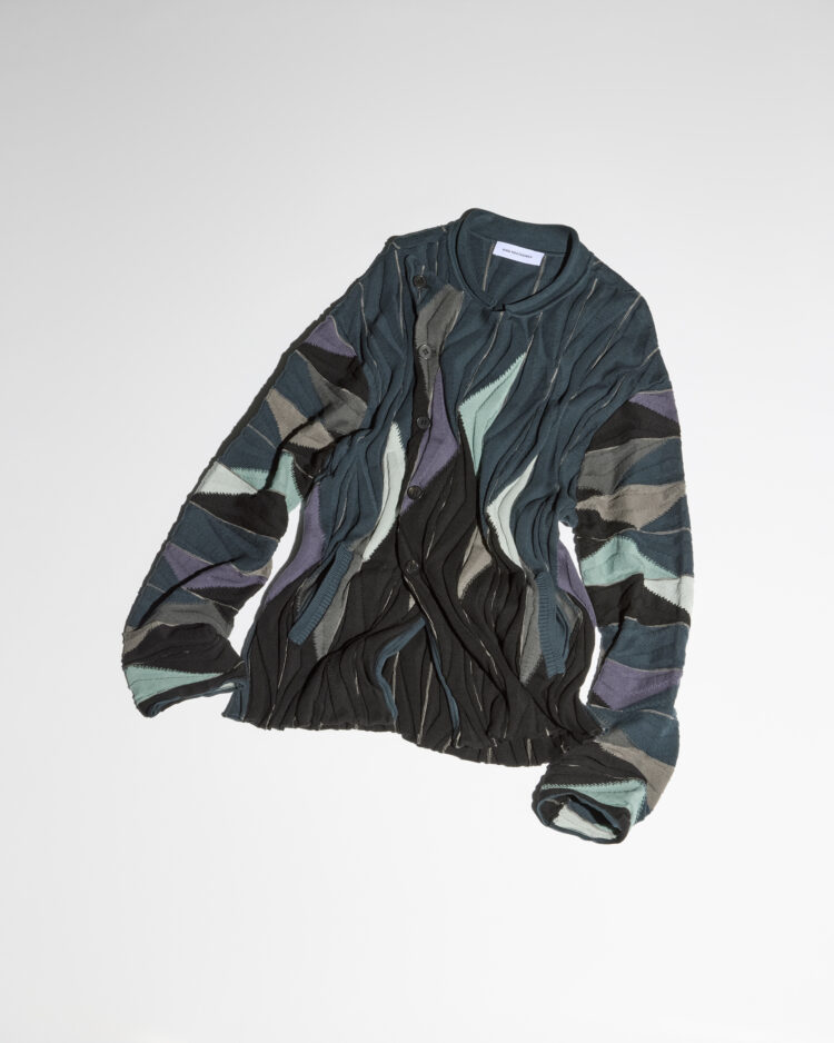 《キココスタディノフ》の2025年秋冬コレクションは、ジム・ジャームッシュが敬愛するハンガリーの映画監督タル・ベーラの作品から着想を得て、孤立した環境で複雑に絡み合う人間像を映し出すようにデザインされた。ハンガリー軍やブルガリア軍ユニフォームのディテールを脱構築し、掠れた多層のイメージを重ねるように表現。「RADAY」ジャケットはアシンメトリーなフロントオープン、ノーカラー、両サイドポケットを備え、テクスチャードコットン糸で編み上げられたリラックスフィットの一着。いくつものレイヤーのインスピレーションをシルクスクリーンに投影したような、ニットジャケットに袖を通したい。