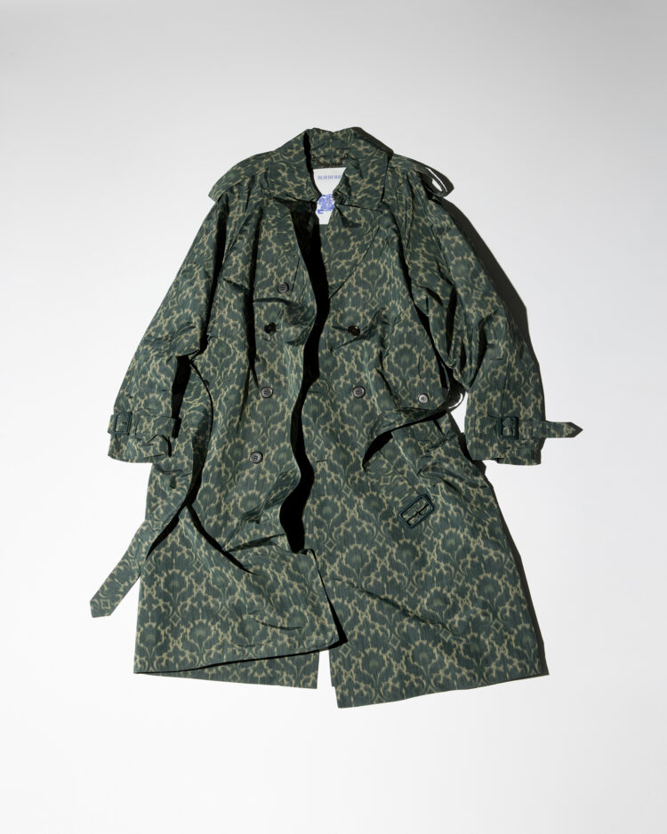 《バーバリー》2025年秋冬コレクションでは、ダニエル・リーが英国のアウトドアとクラシカルな要素を現代的に再構築し、ブランドのヘリテージを鮮やかに昇華させた。ランウェイを飾ったのは、蔓草をモチーフにしたダマスクパターンがバロック様式のように装飾的なトレンチコート。ビスコースとポリエステルをブレンドした生地は、柔らかで滑らかな手触りと美しいドレープ、かすかな光沢を備える。バッファローホーンのボタンやエポレット、レザーで覆ったワイドなBバックルなど、クラシカルとモダンを融合させたディテールが際立つ一着に仕上がった。