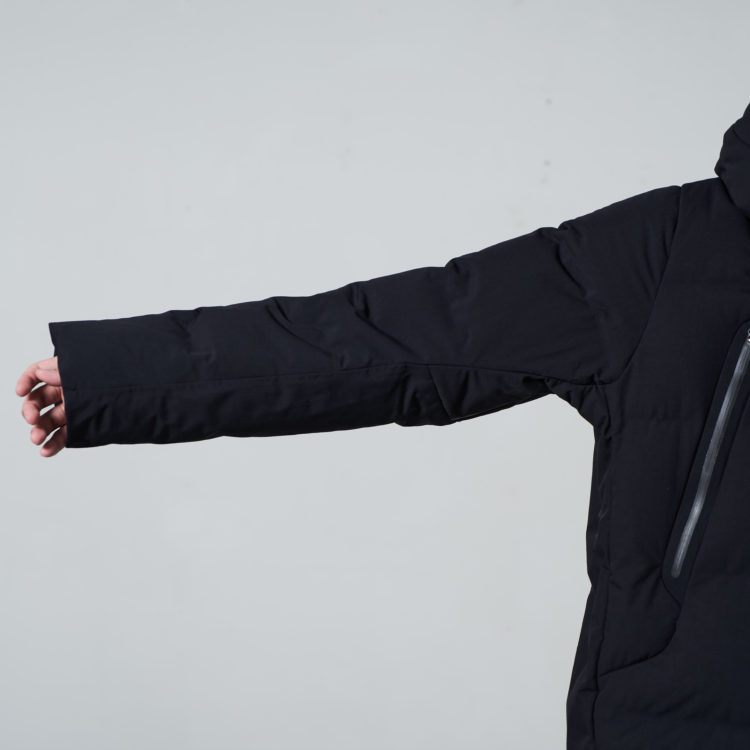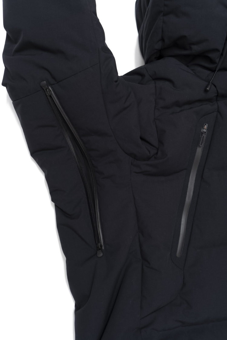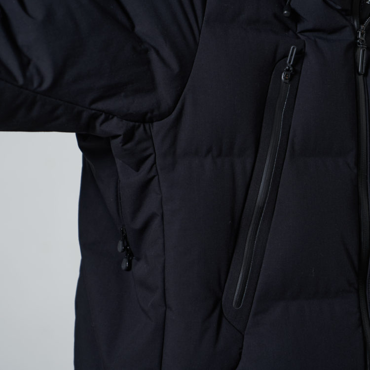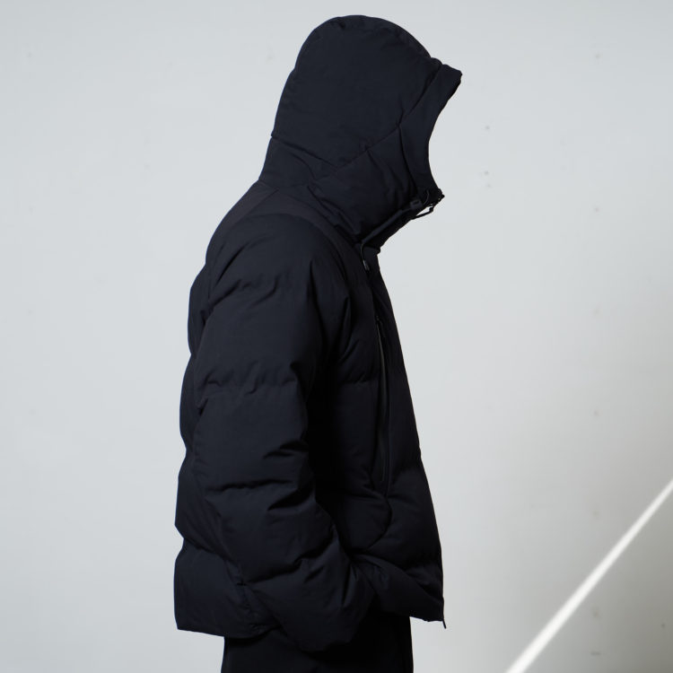 昨年の別注では海外展開用のビッグサイズ”XC”をベースに着丈などを調整したモデルだったが、今シーズンではさらにアームホールを広げ着丈を長くし、より大胆なシルエットに。身体へのフィット感を特徴とする「オルテライン」とは逆説的に形成することで、全く新しい価値観を提案する。素材にはインラインで使用されているストレッチ素材ではなく、光沢感のないマットでコットンライクな風合いの“CEBONNER®”を採用。撥水性・透湿性はインラインと同基準でありながら、綿に比べ74%軽量かつ優れた耐久性を持った高機能素材だ。素材を変えたことで、インラインとは異なるミニマルな質感に仕上がった。さらに機能面においては、ダウンのクオリティーはもちろん、フロントのダブルベンチレーションシステム、フードのパラフードシステム、裏地の”HEAT NAVI®”など「マウンテニア」を象徴する機能は残し、テックウェアとしてのクオリティも高い水準を維持している。