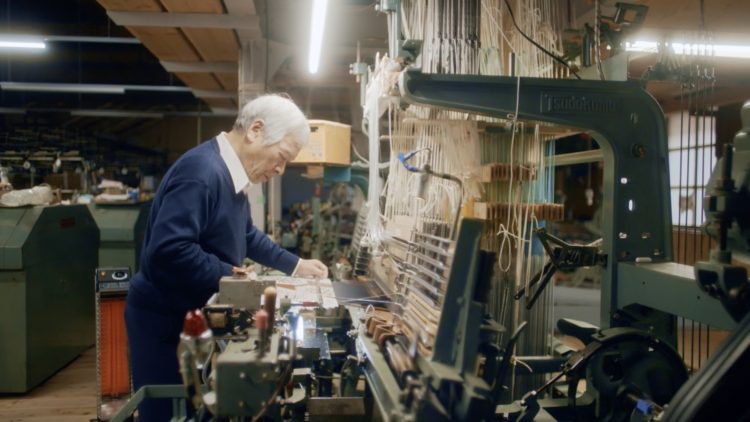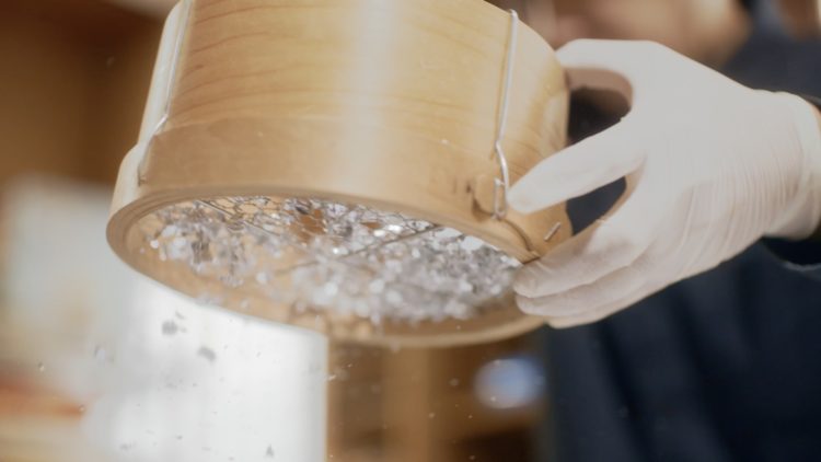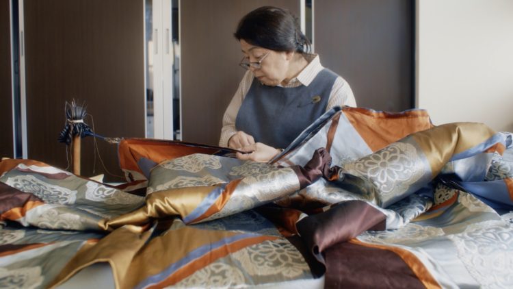 日本に550年以上前から伝わる引箔は、一般的な紙より薄い和紙に銀を貼り付け裁断し、それらを糸状にして織り上げる西陣織の伝統技法だ。