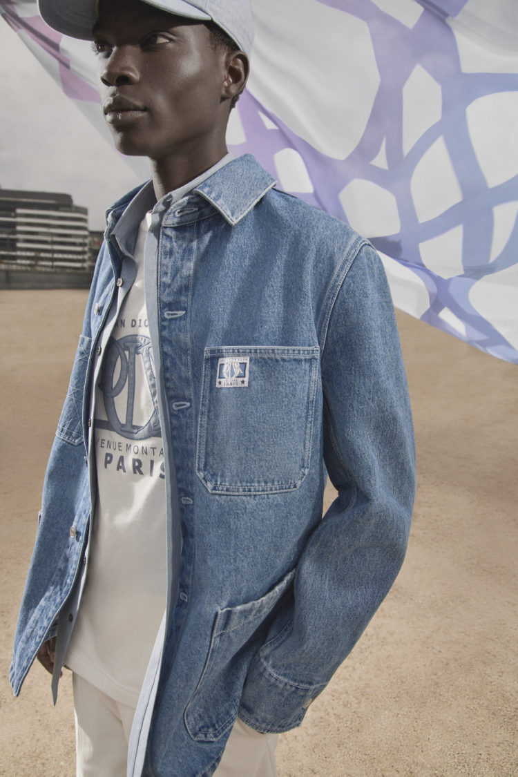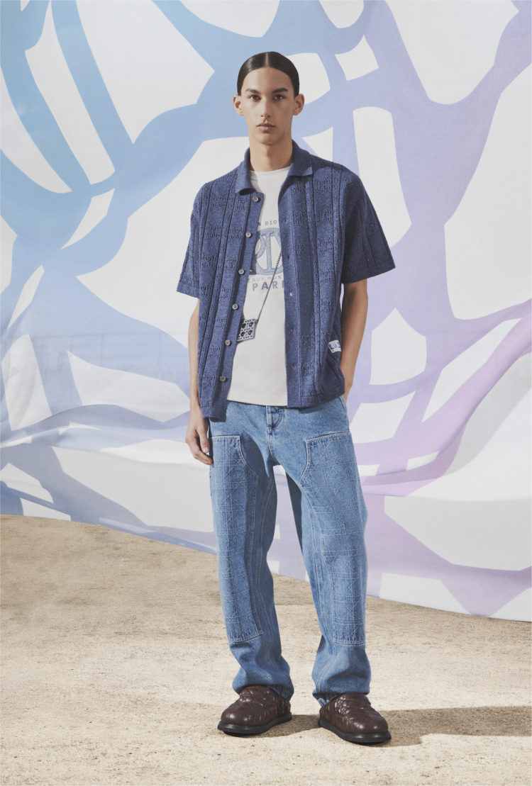 実用性と美しさを兼ね備えた本コレクションでは、「カナージュ」モチーフを全面にあしらったポインテルニットのオーバーシャツやシルクのバミューダ、胸元にCDストラップを付属したベストやジャケット、デニムアイテムなど幅広くラインナップ。ブルーやホワイト、グレーといった、ムッシュ・ディオールのお気に入りの繊細なカラーパレットで展開し、ユニークに再解釈された“D.I.O.R.”チャームの織ラベルを裾や袖口にさりげなく配している。