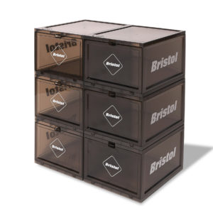 また“魅せる収納”というコンセプトのもと、スニーカーヘッズを中心に人気を集めるシューズボックスは、クリアブラックにアレンジしたカラーリングと既存では展開のない、ハイカットのスニーカーにも対応するサイジングが特徴であり、随所にブランドのアイコンがあしらわれキャッチーに仕上げられた。ルックスだけでなく、湿気を防ぐ通気口や、スニーカーを日焼けから保護するUVカットなどスペックも充実。6個1セットで、スニーカーだけでなく洋服、キャップなどの収納も可能だ。さらに昨年のリリースより人気を博した多機能ボックスは、機能性、デザイン性、コストパフォーマンスの高い収納雑貨を展開する《スタックストー》とのコラボレーションであり、ベースには同ブランドの定番人気モデルである「PELICAN GARBEE」を採用。《F.C.レアルブリストル》のブランドカラーであるブラックを基調に随所にブランドのアイコンを配してカスタマイズしており、ゴミ箱、ツールボックス、ランドリーボックスなど仕様用途は様々にアレンジすることができる。どちらも、自分のライフスタイルに合わせて自由に楽しめるプロダクトだ。