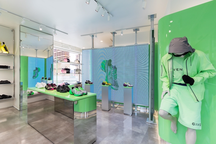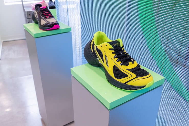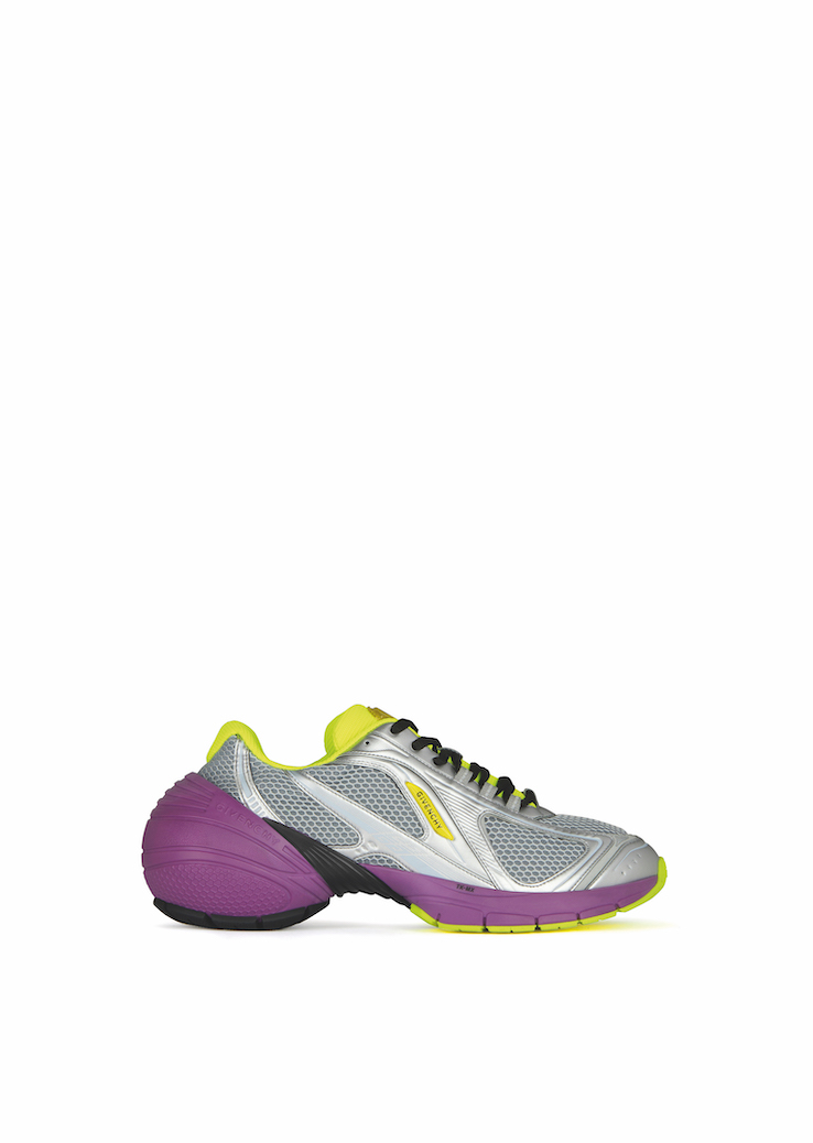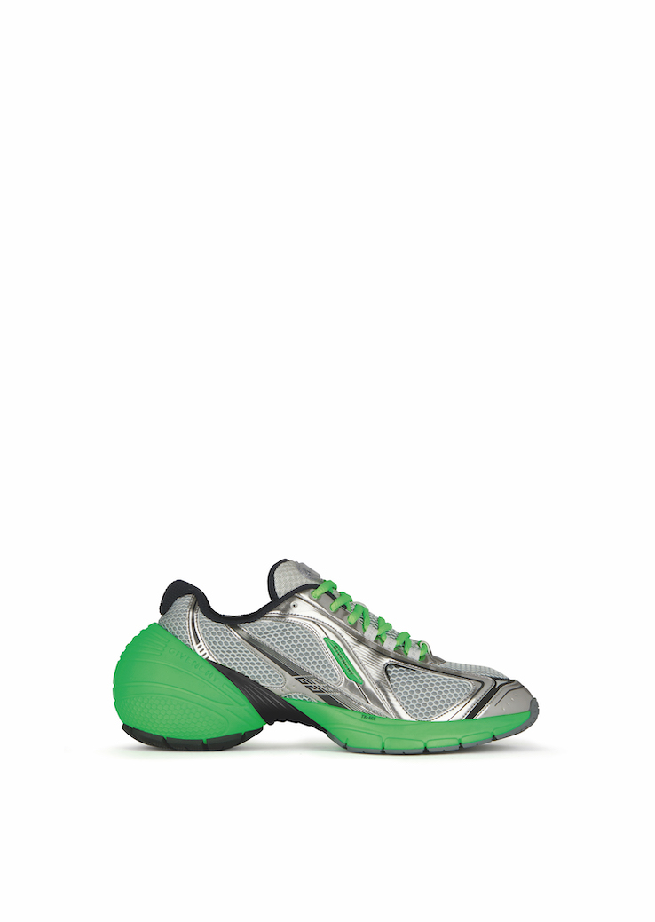 アッパーには高周波テクスチャーやプリント、ラバーが施されており、靴底のメッシュのようなモチーフがユニークなフットプリントを可能にする。そして、サイドにさりげなくプリントされた“4Gロゴ”と“GIVENCHY”の文字が入ったバブルが、このハイエナジーなスタイルを完成させている。