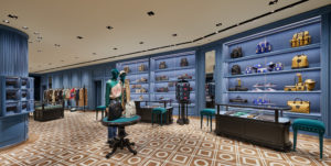 このショップは、大きなガラスのファサードによりショップ内外から視界をさえぎらないように設計されており、美しい素材を取り入れながらスペースを贅沢に使った、《グッチ》ならではのコンテンポラリーラグジュアリーを提案。コレクションの特徴であるエレガントでコンテンポラリーな折衷主義と共鳴するように、伝統とモダン、インダストリアルとロマンティックなエレメントが融合しており、この独創的な融合は対照的な素材を並置することにより表現される。テクニカルなディスプレイユニットと、空間を飾るファブリックの柔らかさとのコントラストやリベット、ジオメトリックパターンがあしらわれたスティールブルー、セージグリーン、そしてペールピンクのベルベットウォールが特徴的だ。さらに、ショップの随所にラグジュアリーな椅子とラウンドテーブルが配置され、ヴィンテージのオリエンタルラグが敷かれる。