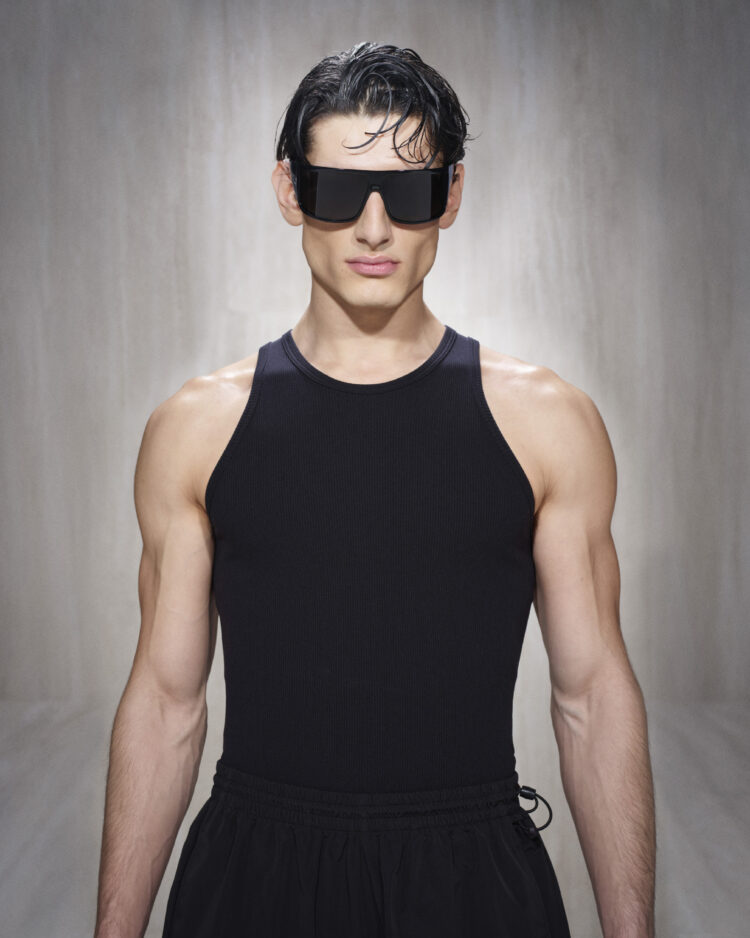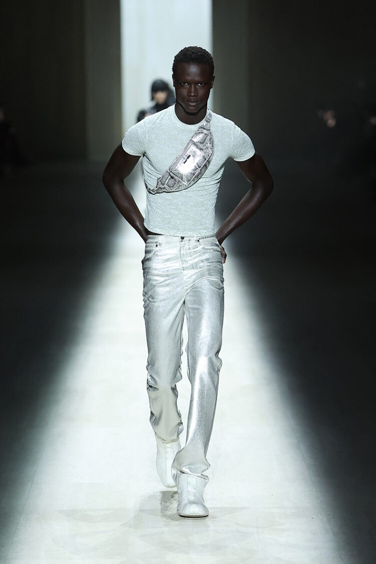 デムナが「私の美意識を育んできた彫刻作品からのインスピレーション」が本コレクションの核にあると語ったように、ルネサンスが理想とした均整のとれた肉体美を想起させるアドニス ルックも登場。ギリシャ彫刻のようにドレープをまとったTシャツにスケータースタイルを掛け合わせたルックや、ルネサンス絵画“ヴィーナスの誕生”を思わせるホワイトのスレンダーなドレスへと展開した。スポーティなトラックスーツやブルゾンにランジェリーライクなドレスなど、対極にある要素を交差させるアプローチも印象的であった。