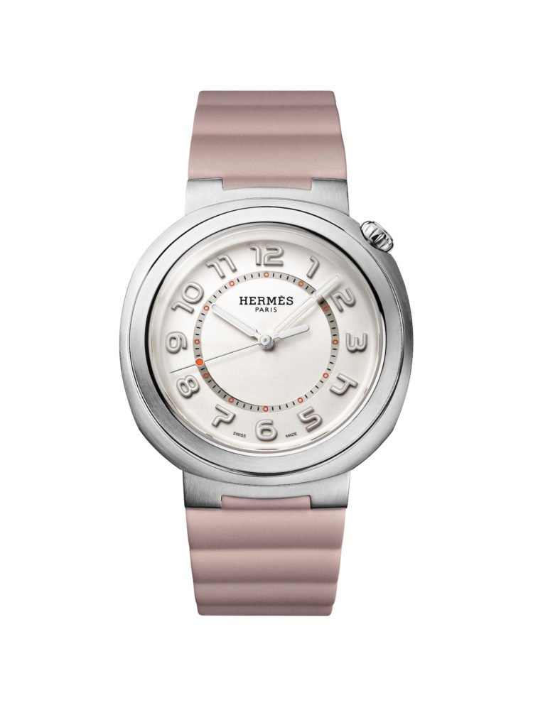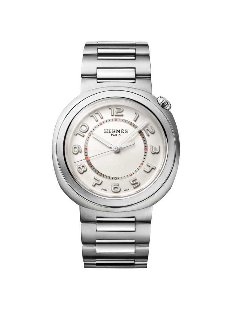 平面の円と立体的な丸みを合わせたようなフォルムの時計「エルメス カット」は、ブランドが得意とする幾何学的なデザインの遊びを散りばめた。1時半位置という大胆な配置で意外な存在感を放つリューズは、オレンジのラッカー仕上げとエングレービングによる「H」の文字を刻印。シルバーオパーリンのダイアルには、夜光塗料を塗布したユニークなデザインのアラビア数字インデックスとバトン型の時針を配し、暗所での視認性も確保している。