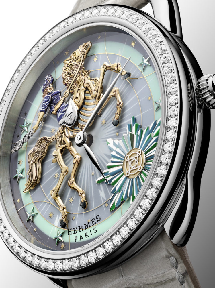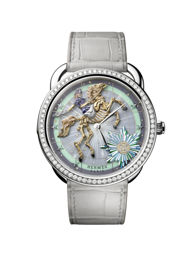 野村大輔がデザインしたコーラス・ステラルムのスカーフに着想を得た「アルソー」は、職人の手によって仕上げられた躍動感あふれる馬とスケルトンの騎手がダイアルに配されている。彫金のほか、シャンルヴェ技法で作られた星座やラッカー塗装の星空、ロジウムメッキ加工の星たちが美しくデコラティブな世界観を演出している。9時位置のプッシュボタンを押下すると、星座の周りを怪奇な骸骨たちが跳ね回る幻想的なアニメーションを再生することが可能だ。