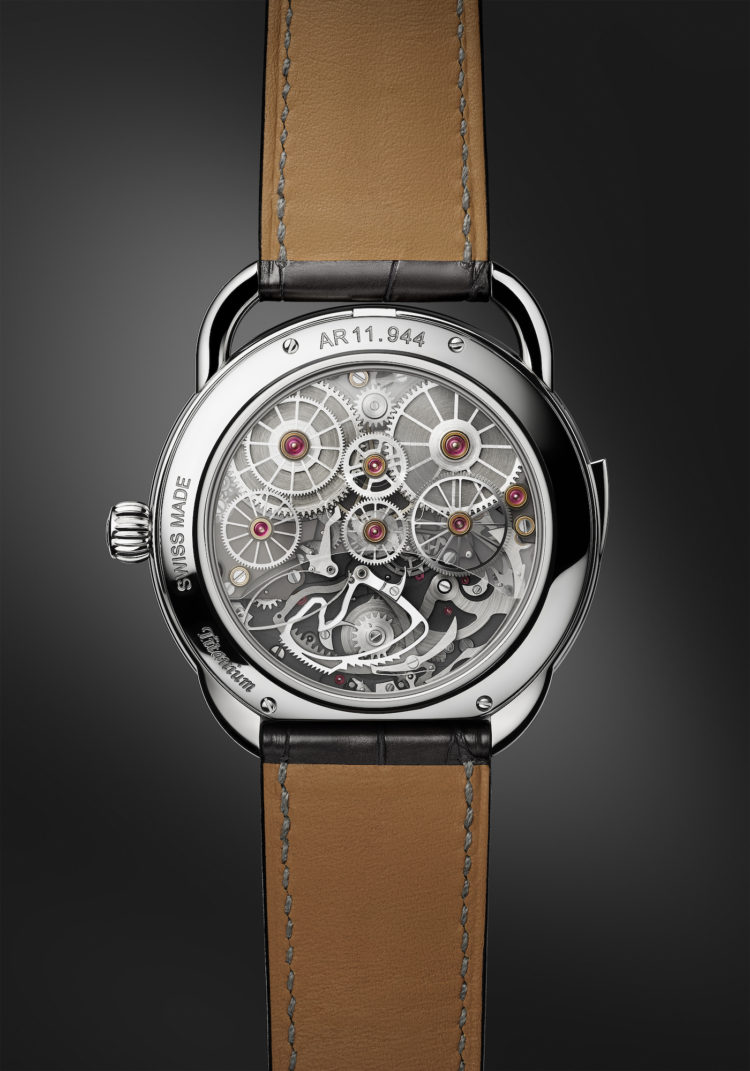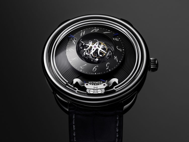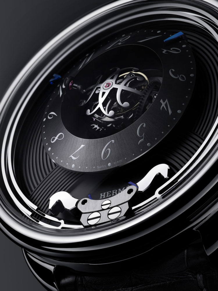 中心部には、1900年のエミール・エルメスとジュリー・オランドの結婚を象徴する2つの「H」を重ねたトゥールビヨンキャリッジを配し、アラビア数字インデックスを用いたリング状のダイアルをセットした。トゥールビヨンは3軸に回転し、それぞれ300秒、60秒、25秒の周期を刻む。6時位置の馬の頭の形を模したミニッツリピーターのハンマーが、硬化スティール製の音叉型ゴングを叩くと同時に、大聖堂の鐘を想起させる音色を響かせる。