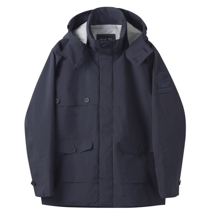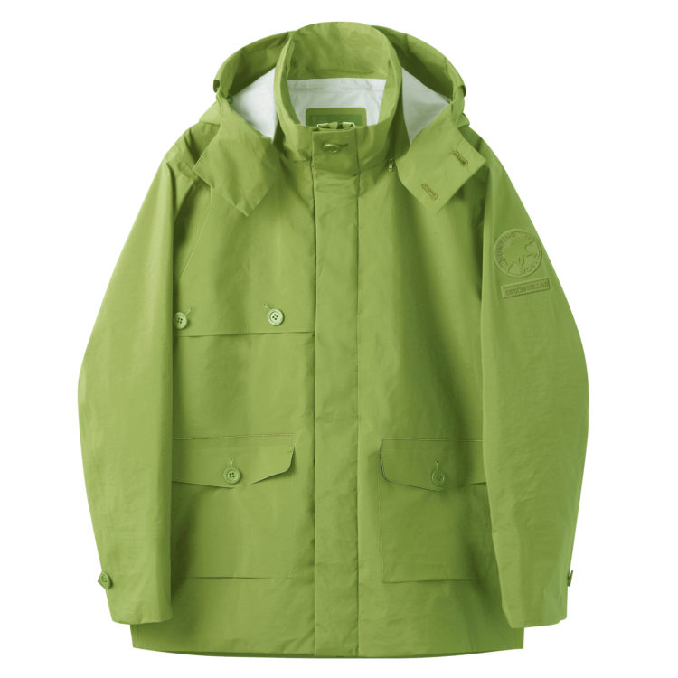 ハンティング・ワールドオリジナルのフィールドジャケットをベースにデザインされた「ハードシェルフィールドジャケット」。フロントはジッパーとオリジナルメタルボタンを使用した二重前立て。袖口のスリーブアジャスターやポケット部分は、レーザーカットでソリッドに仕上げられた。フードはファスナーで簡単に取り外しができ、スタイリングにあわせてアレンジすることができる。