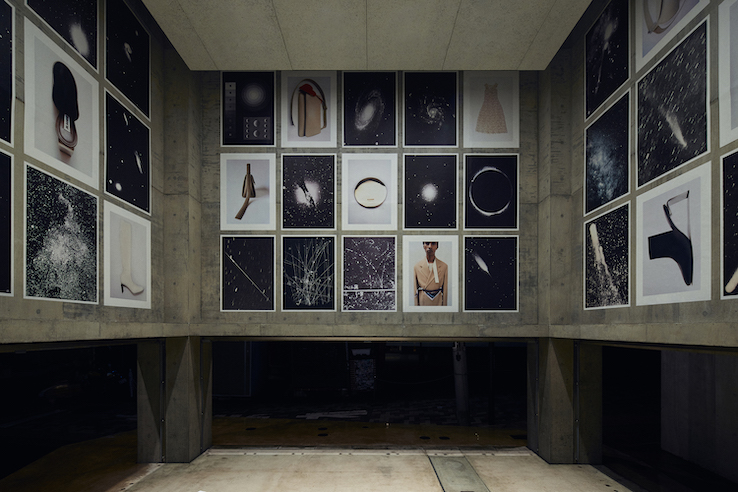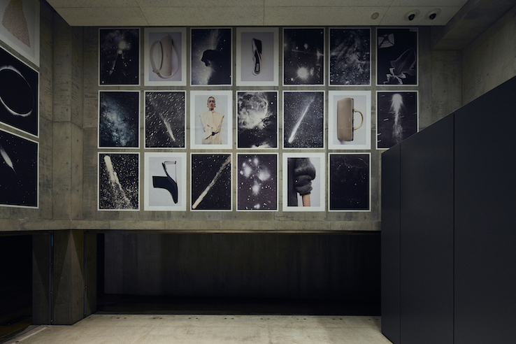 外壁にはシルバーのシューズのビジュアルを大々的に展開し、内部には《ジル サンダー》のアイテムビジュアルとともに、スーター自身が古い本や雑誌から集めた宇宙のモノクロ写真を格子状に並べた。