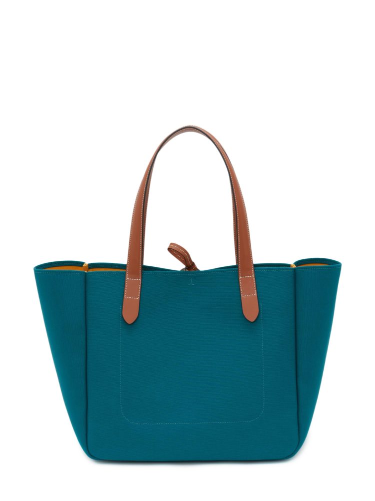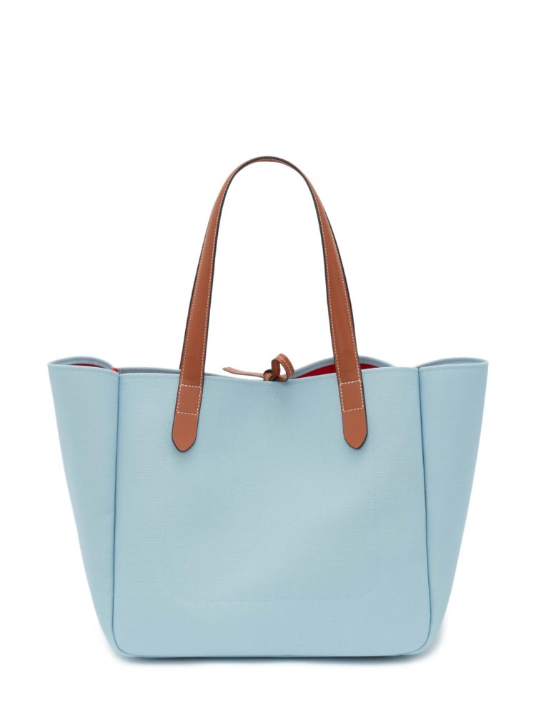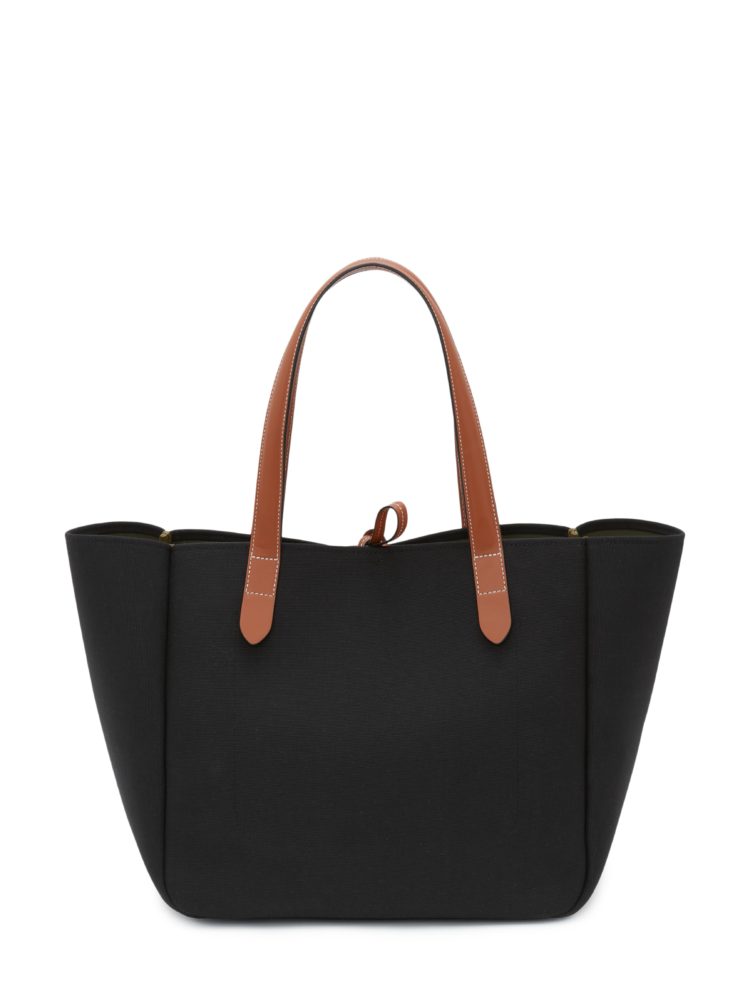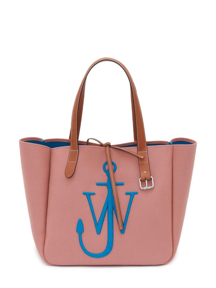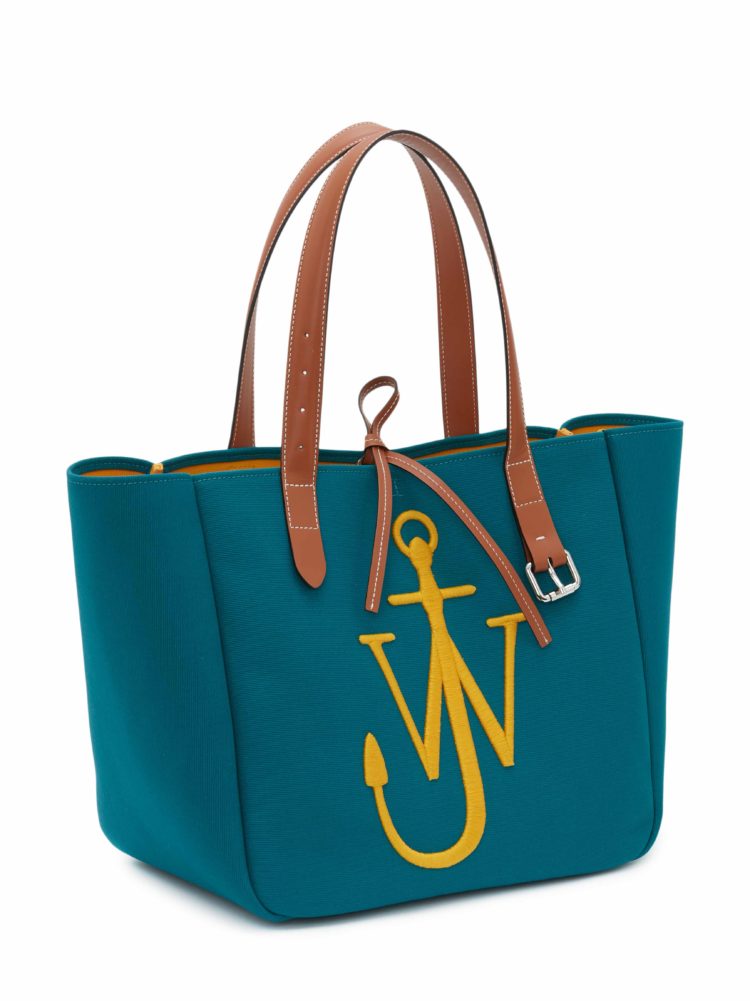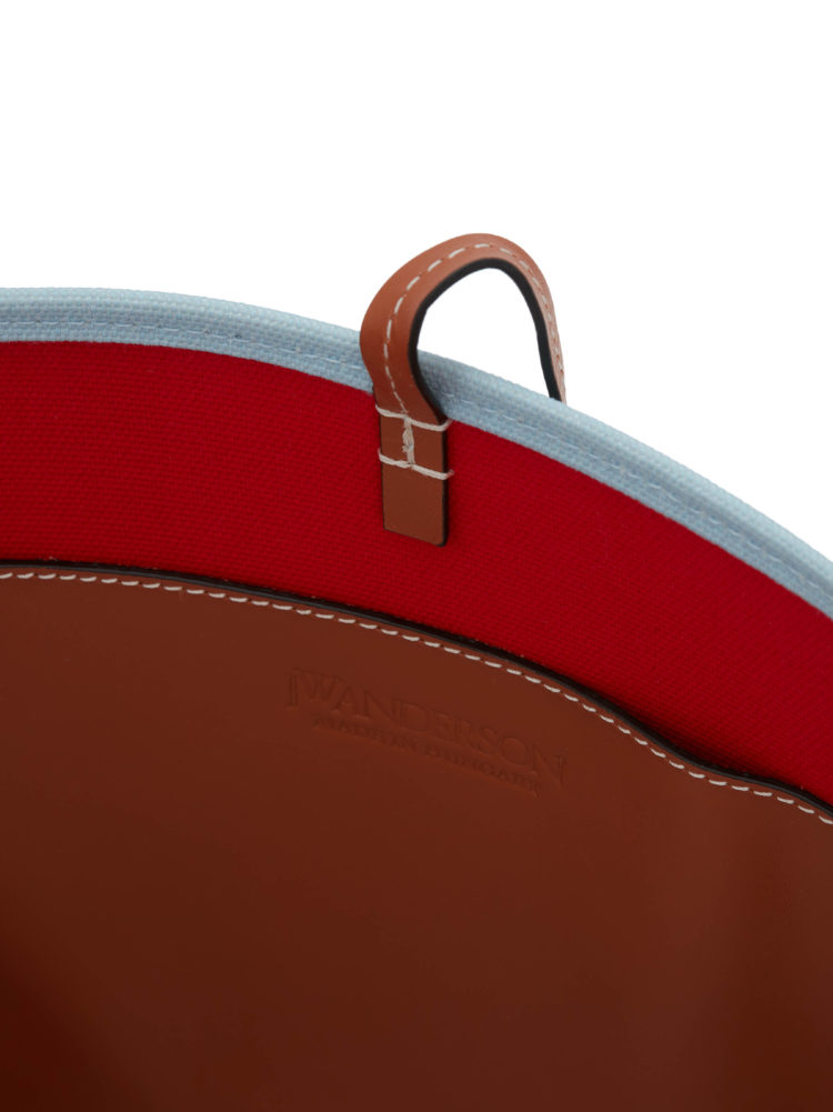 今回登場するリサイクルキャンバスのバージョンは、ペットボトルをリサイクルすることで生まれるキャンバス生地を使い、オリジナルをアップデートしたものだ。おおよそ500ml のペットボトル9本分から1つのアイテムができており、使われているリサイクル素材を認証、社会そして環境に十分に配慮していること、生産過程で危険な化学物質の使用を可能な限り抑えていることを保証するGRS認証を得たプロダクトとなっている。ディテールは、25mmのシルバーバックル付きのレザーベルトを模したハンドルが特徴。リサイクルキャンバスのバージョンはブラック/グリーン、ペトロール/イエロー、レッド/ブルー、ピンク/ブルーのユニークなカラーバリエーションで展開され、《JW アンダーソン》のアンカーロゴが立体的に刺繍された。底面はレザーで補強され、開け口にはレザーの紐が取り付けられた。内側は裏地なしのコントラストカラーでスリップポケットが付いており、ウェビングテープで仕上げられている。