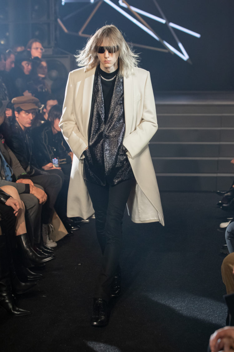 スキニーなブラックレザーのパンツに、無数のスタッズを打ったライダースジャケットの「ダブルレザー」のコーディネイトがファーストルック。モデルはロン毛でカーリー、もちろん鋭角のサングラスをかけている。続いて、ラインストーンを全身につけた同じく「ダブルレザー」が続く。早くもエディのロックな世界が全開だ。黒のセットアップが続いた後、オーバーサイズの白いコートが登場。絶妙なアクセントとなっている。レザーのアイテムに交じって、イングリッシュツイードを用いたチェックのテーラードスーツやコート、また、一転してストリートっぽいスポーツジャケットやデニムのルックも。12月のロサンゼルスのショーを反転したように、ウィメンズも数体披露した。次々と現れるルックは、完全にロックでユース。エディ・スリマンの《セリーヌ》は不動だ。