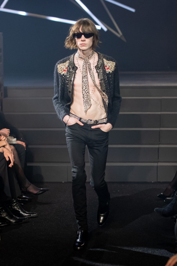 さらに、高級素材やパリのクチュールの技も随所に見られ、大きなレオパードやタイガーがプリントされたコートはカシミヤのシアリングで作られていたり、シャツなどに施された細かな刺繍はアトリエでの繊細なハンドワークによるもの。そこがエディ・スリマンの《セリーヌ》を十分に納得させられるところだ。