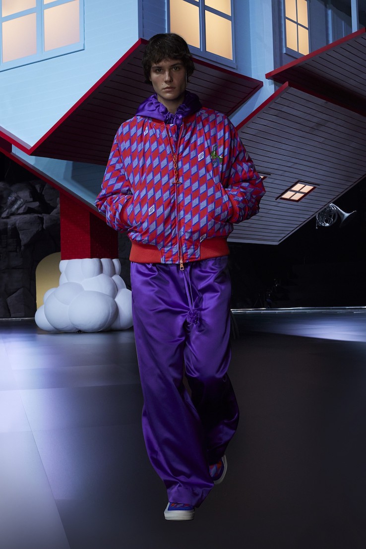 今回は、ダイヤモンドカットになったダミエ・パターンを、夏を感じさせるパープル、オレンジカラーのジャケットやシャツに施した。また、スポーティーなトラックスーツやボンバージャケットも登場し、日常のコーディネートに溶け込むアイテムが並ぶ。
