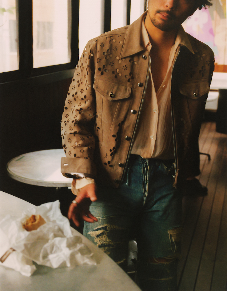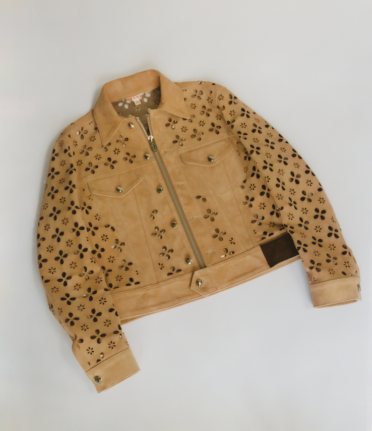 今回「スーパー エー マーケット 青山」は、《エム エー エス ユー》の新作ジャケット「FLOWER-CUT LEATHER TRUCKER JACKET」をベースに、ピーナッツカラーを別注。 ブランドのシグネイチャーである、レーザーカットデザインを用いた本アイテムは、デニムジャケットを彷彿とさせるシルエットと花柄のカットワークのコントラストが目を引く。イメージビジュアルには、デザイナーの後藤氏と親交のあるバンドMONONO AWAREの玉置周啓氏が出演し、写真家の伊藤明日香氏が撮り下ろした。