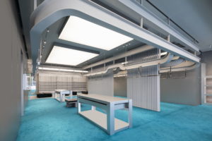 このストアでは、光沢のあるメタルとマット仕上げのメタル、スモークをかけたガラスとクリアガラス、スパッターダッシュとローズウッドのアクセント、実用的な照明とギャラリースタイルの照明などのバランスが、ハイブリッドなリテールウェアハウスを意図的に連想させる。 バックウォールに設置したベネチアンブラインドの縦型カーテンと、ロゴが施されたティール色のカーペットは、典型的なオフィスの美観からインスピレーションを得たものだ。