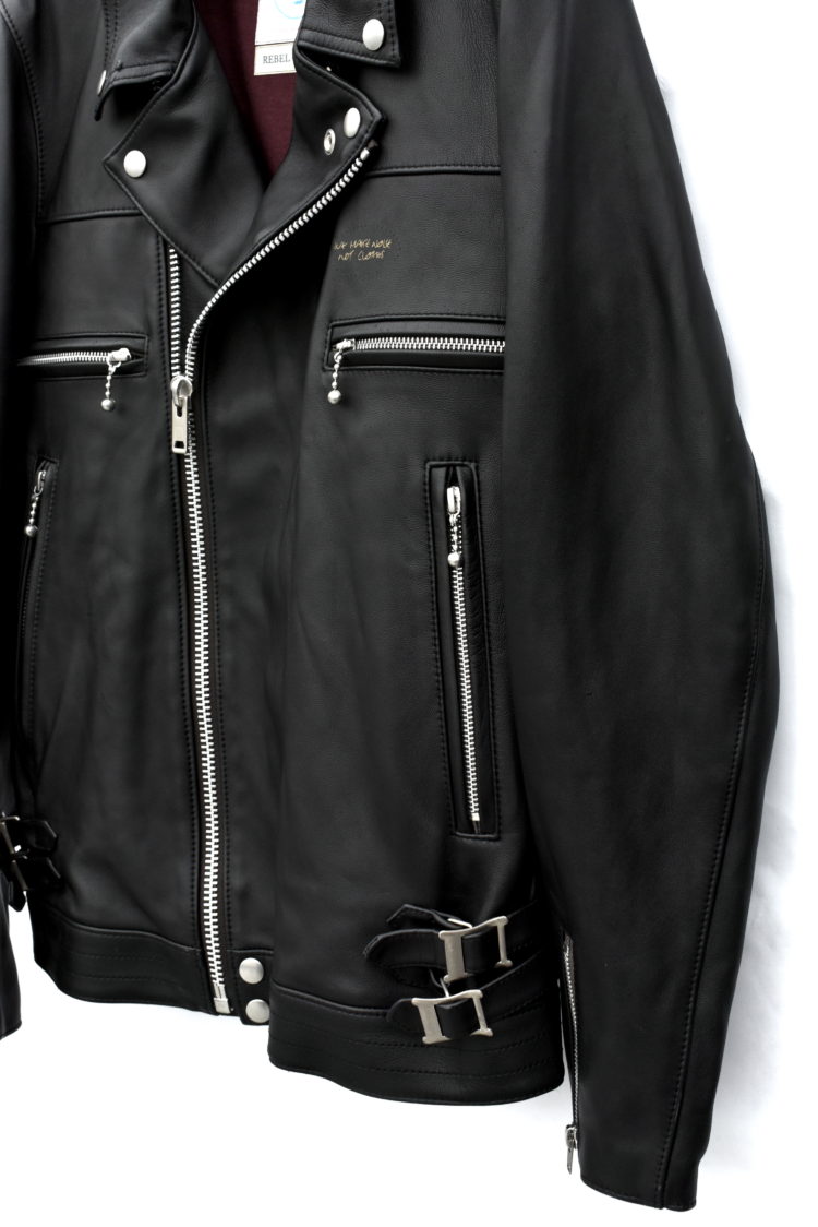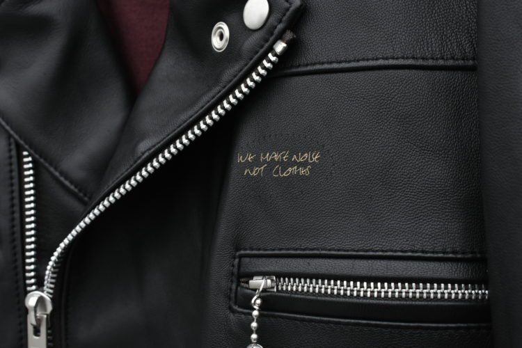 ここに紹介するレザージャケットは、2008年秋冬シーズンに発売されて以来、《アンダーカバー》のレザーライダースのシグニチャーアイテムとして展開されている。フロントに配置された4箇所のボールチェーンファスナーのポケットやファスナーテープの配色、両サイドの4本のアジャスターベルトなど、細部に拘ったプロダクトが特徴的だ。胸元に施されたゴールド箔のプリント“WE MAKE NOISE NOT CLOTHES”(私たちは服でなくノイズを作っている)は、《アンダーカバー》が掲げるスローガンである。セックスピストルズに影響を受けたデザイナーの高橋氏らしいパンクなメッセージだ。また、ラペルを低い位置に設定することで、適度な抜け感のあるダブルライダースに仕上げている。素材には、テカリすぎないマットなツヤ感が美しいカウレザーを使用。深みのある赤色の裏地が、どこかミステリアスな雰囲気を放っている。男らしく無骨に着こなすのもよし。エレガントに着こなすのもよし。¥176,000(税込)