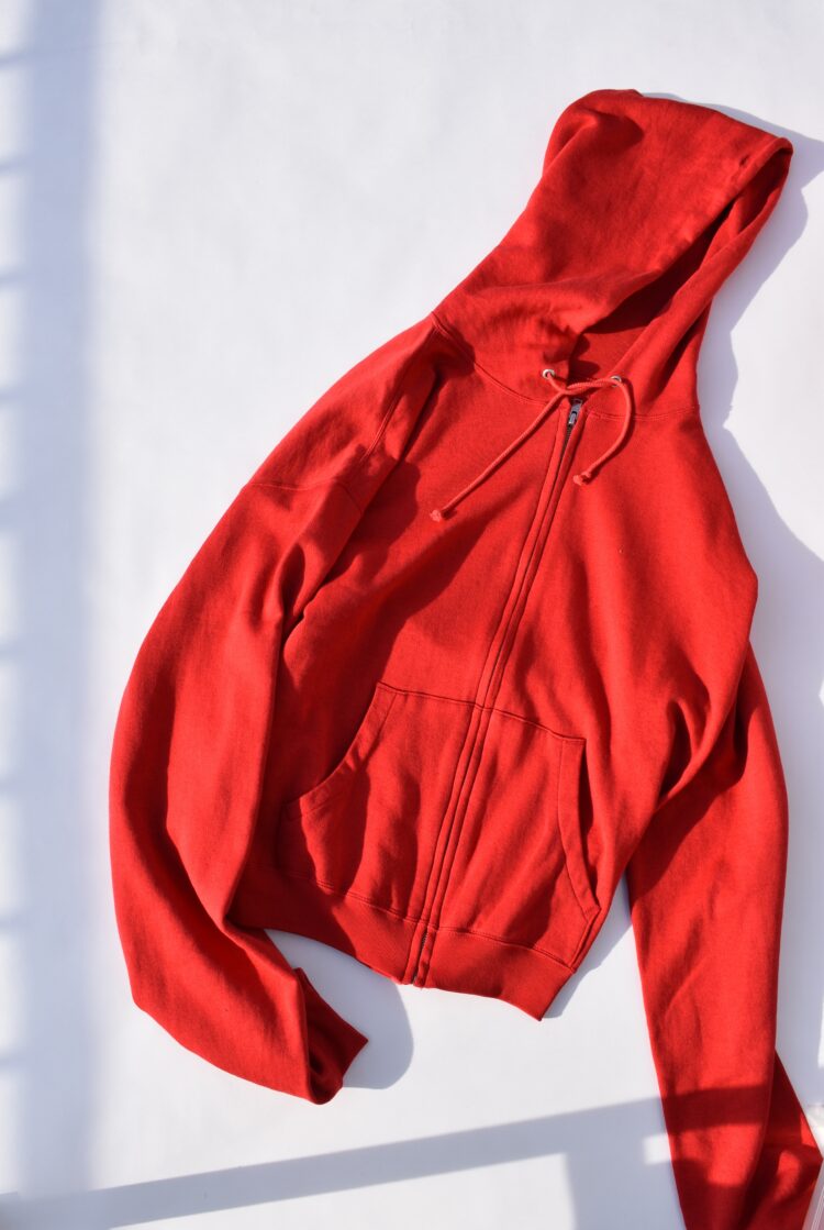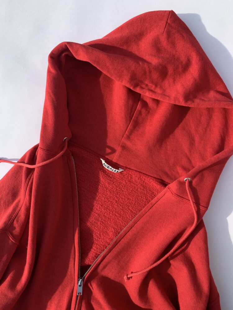 《オーラリー》のジップパーカーは薄手でありながら、適度なハリを備えた素材感が特徴。表面には強撚の細番手コットンを、裏面にはコットンシルクの混紡糸を用いて編み立てている。肌に触れる裏面には微起毛を施し、ふんわりと柔らかなタッチを実現。一方、表面は強撚糸ならではのドライでシャリ感のある風合いが際立つ。さらに中層にコットンウールの混紡糸を配することで、素材全体に程よい膨らみとコシをプラス。機能性や快適性を追求しながら上質な表情が共存する、《オーラリー》らしい奥行きのある素材だ。