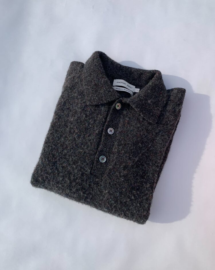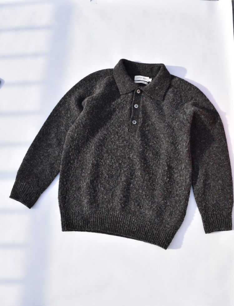 《アナザー アスペクト》は、2019年にコペンハーゲンで3人の友人によって始まったブランド。モダンでタイムレスなワードローブを軸に、再生繊維や認証オーガニックコットンなど環境に配慮した素材を用いたスローファッションを実践する。このラムウールポロは、スコットランド・ボーダーズ地方の熟練ニッターによって編み上げられた。起毛加工によるシャギーな表情と、ラグランスリーブやリブ編みの裾といったクラシカルなディテールが、さりげない遊び心と確かな品格を感じさせる一着だ。