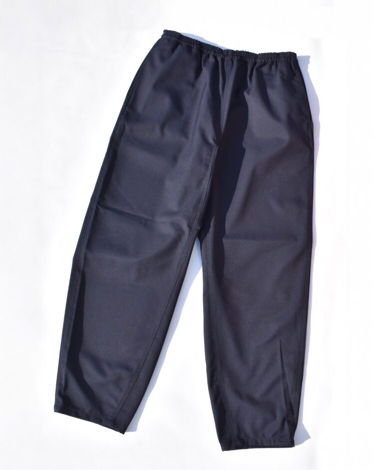 《サン リミット》は、門田雄介(もんでんゆうすけ)氏が2012年に立ち上げたシャツを主軸とするトータルブランド。《コム デ ギャルソン・シャツ》で企画生産やパタンナーを務めた経験から、「いつでも同じものが買える」定番服を追求してきた。本作はウールギャバジンを用いた定番パンツ。年間を通して着用できる張りのある素材に、やや太めのシルエットを採用。脇線のパッカリングがさりげない表情を生み、緻密なカッティングによって穿いた際の美しいラインが際立つ。