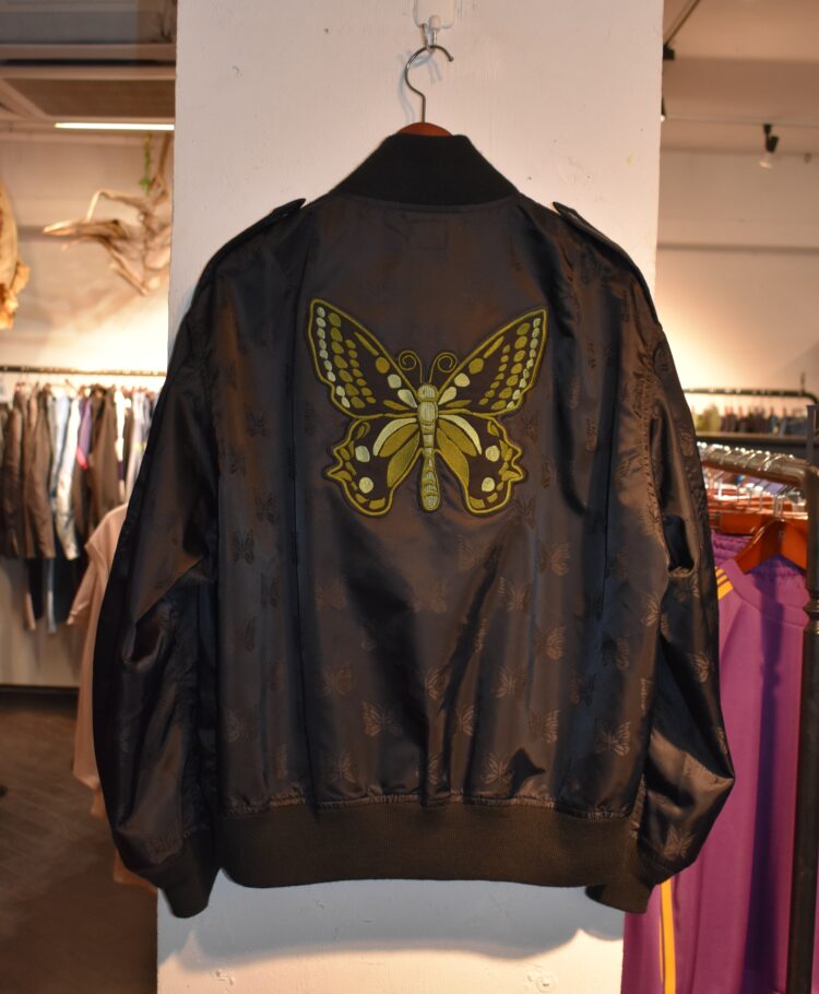 エポレット、ジップエンドなどのオリジナルディテールに加え、《ニードルズ》のパピヨンパターンがジャガードの織り込みで配されたボディが印象的。パピヨンやスマイルマーク、ピースマークの刺繍ワッペンのカラーリングも非常に楽しい。過去の《ニードルズ》のワッペンや、お持ちのヴィンテージのワッペンを付けてカスタムしてもいいだろう。アメリカンカルチャーをベースに《ニードルズ》らしいデザイン、エッセンスを散りばめ唯一無二なジャケットに昇華させている。
