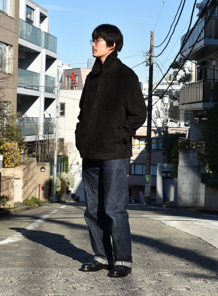 「トゥモローランド」PRの井上直哉さんに此方のジャケットを中心にコーディネートを組んでもらった。主役となるスエードブルゾンの襟を立て、≪BOWERY BLUE MAKERS(バワリーブルーメーカーズ)≫のリジットデニム、足元は≪フラテッリジャコメッティ≫のブーツで合わせたスタイリングを披露。品のあるスエードレザーにデニムを合わせ、男臭い雰囲気は残しつつも、洗練された色っぽさのあるスタイリングとなっている。